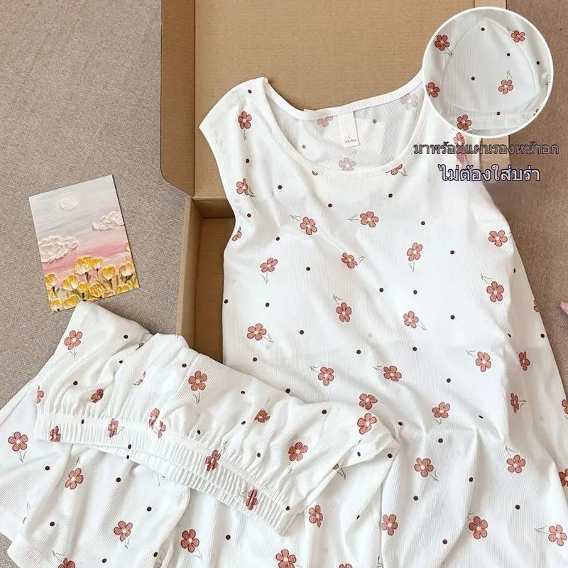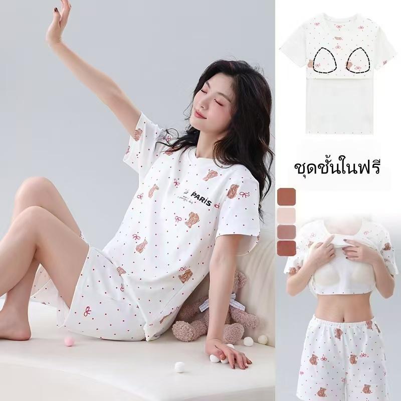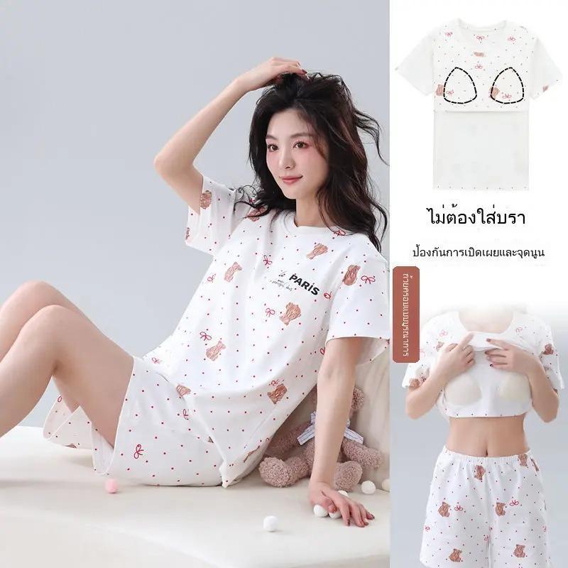ซื้อ 1 แถม 1 ชุดนอนพร้อมแผ่นซับน้ำนมสำหรับผู้หญิงฤดูร้อนผ้าฝ้ายแขนสั้นชุดสองชิ้นบางขนาดใหญ่สวมใส่ในบ้านฤดูร้อนใหม่
