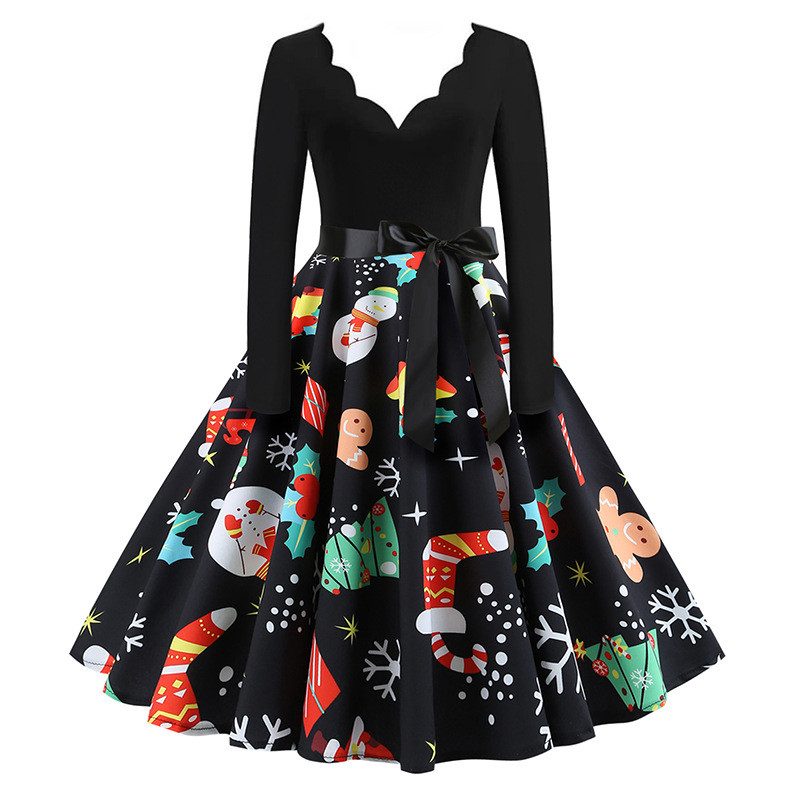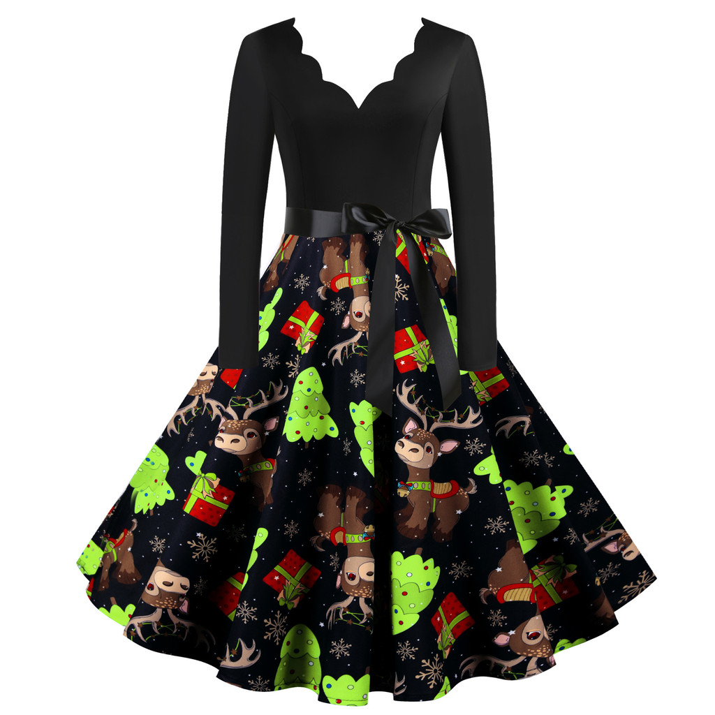 ชุดวินเทจฮีปเบิร์นสำหรับผู้หญิง ลายดอกไม้Burnt สไตล์คริสต์มาส คอวีแขนยาว ดีไซน์ทรงผมตรง กระโปรงบานใหญ่ เหมาะสำหรับฤดูหนาว