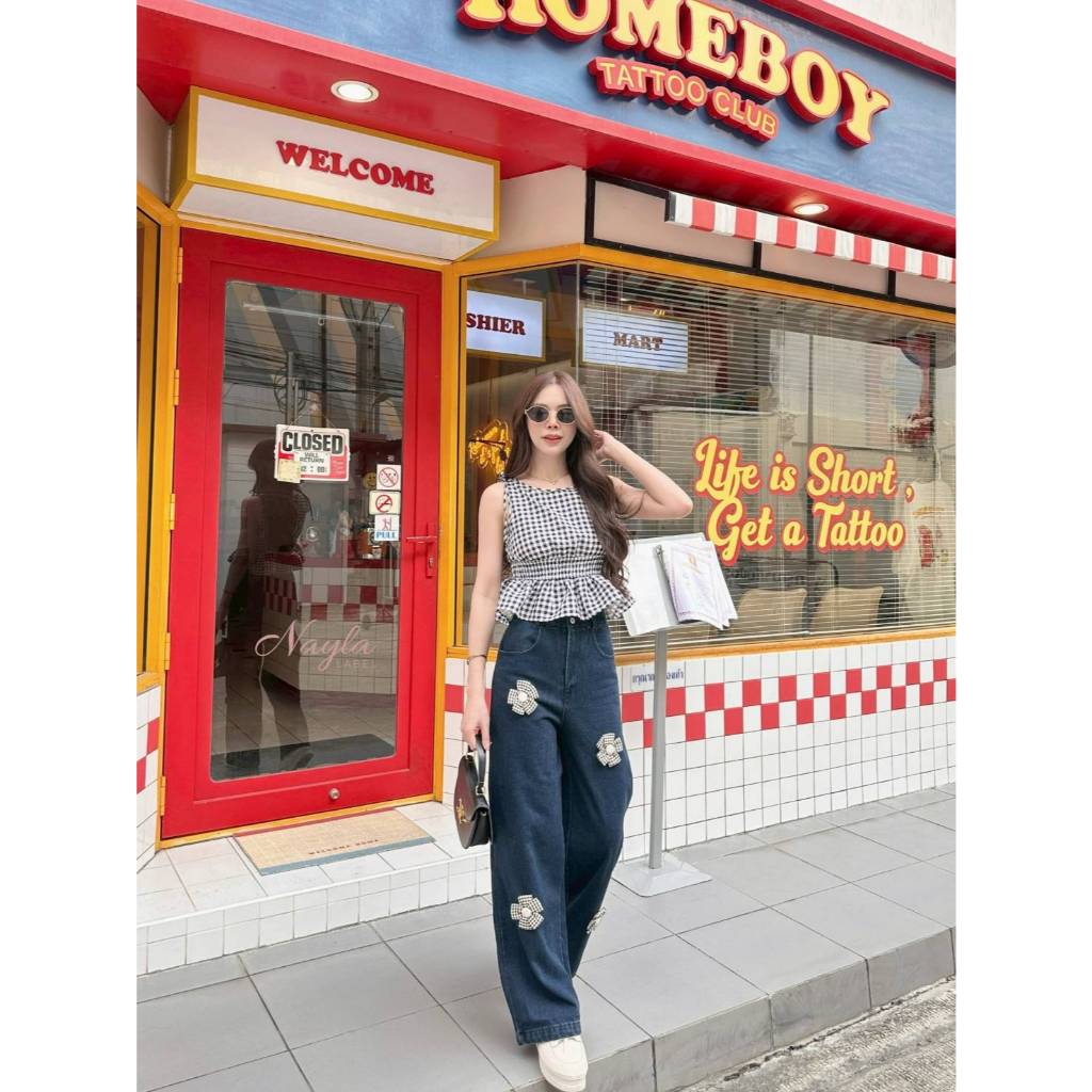 ?น่ารักสไตล์มินิมอล ตัวกางเกงยีนส์ขายาวสีกรมแต่งดอกไม้สก็อตดำขาว มาคู่กับเสื้อสก็อตดำ เก๋ๆ แบบชิคๆ แอนด์ชิว แมทซ์ได้ลงตัว ใส่แยกก็สุดปัง ใส่รวมก็สวยสุด ?