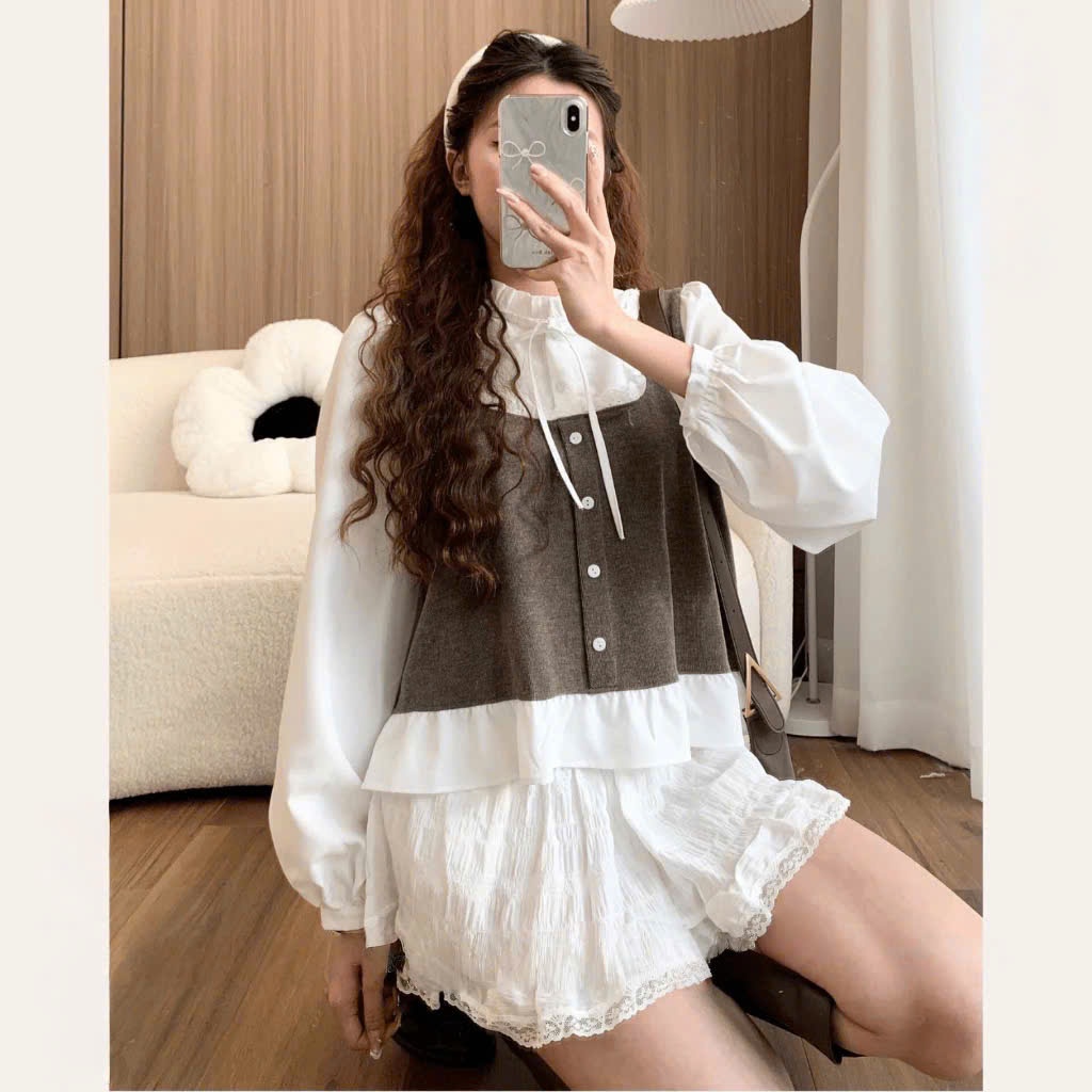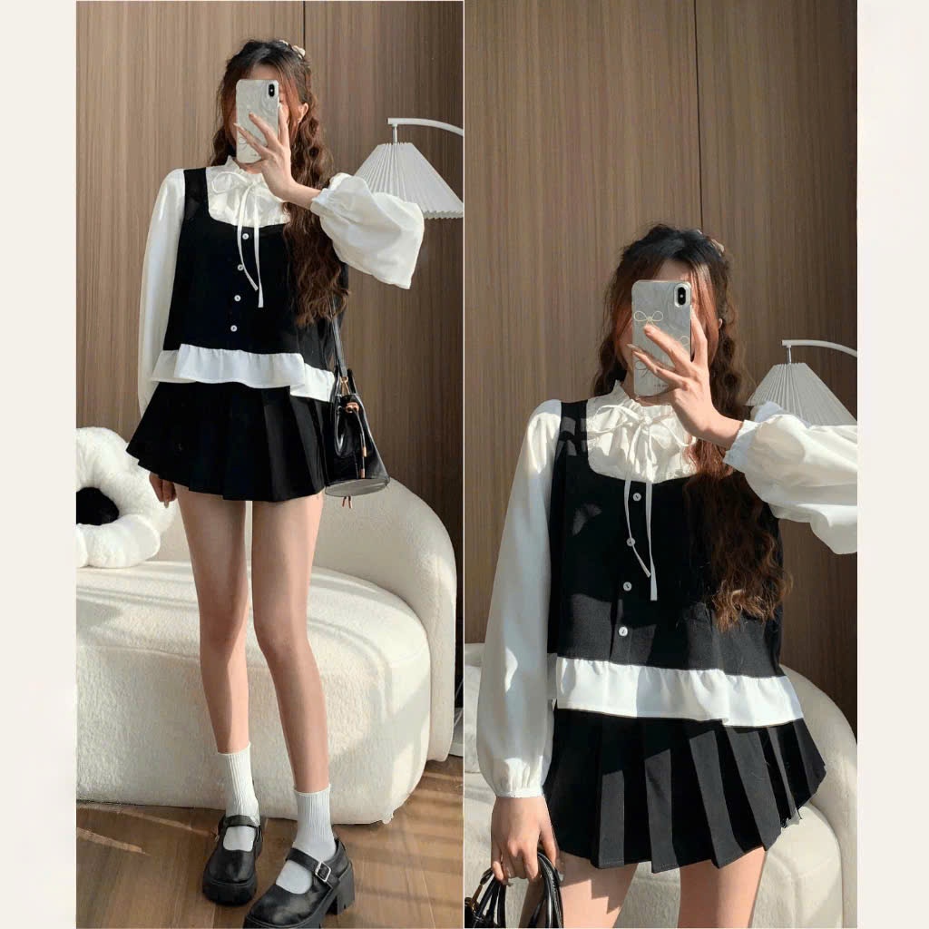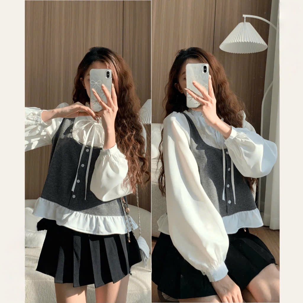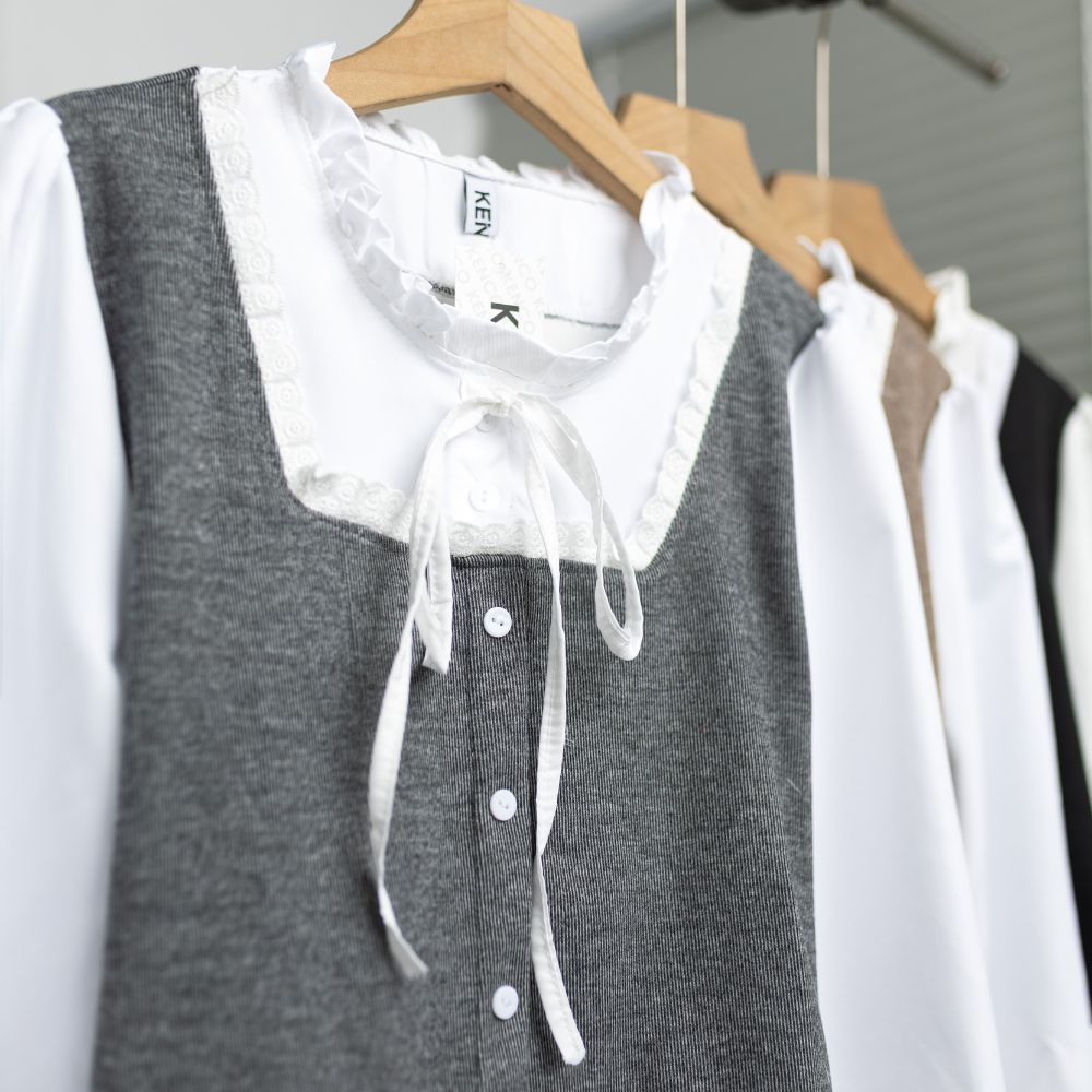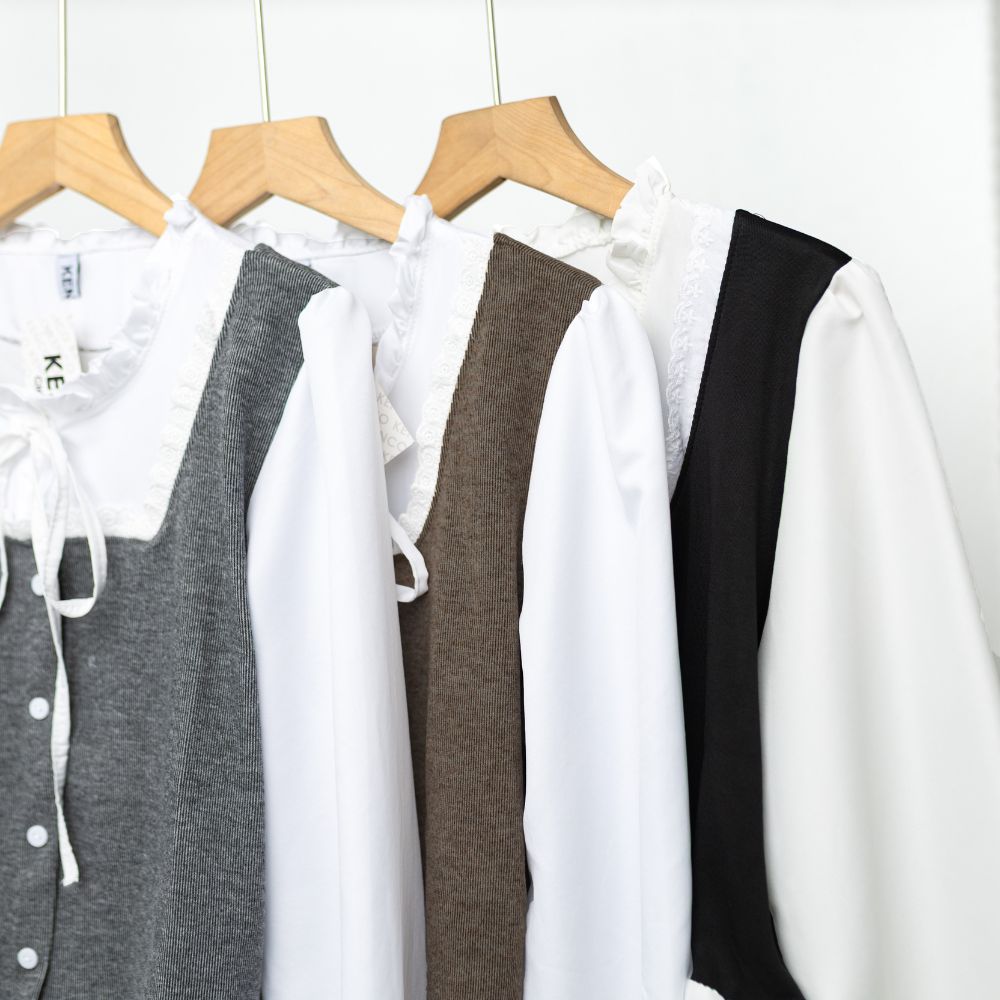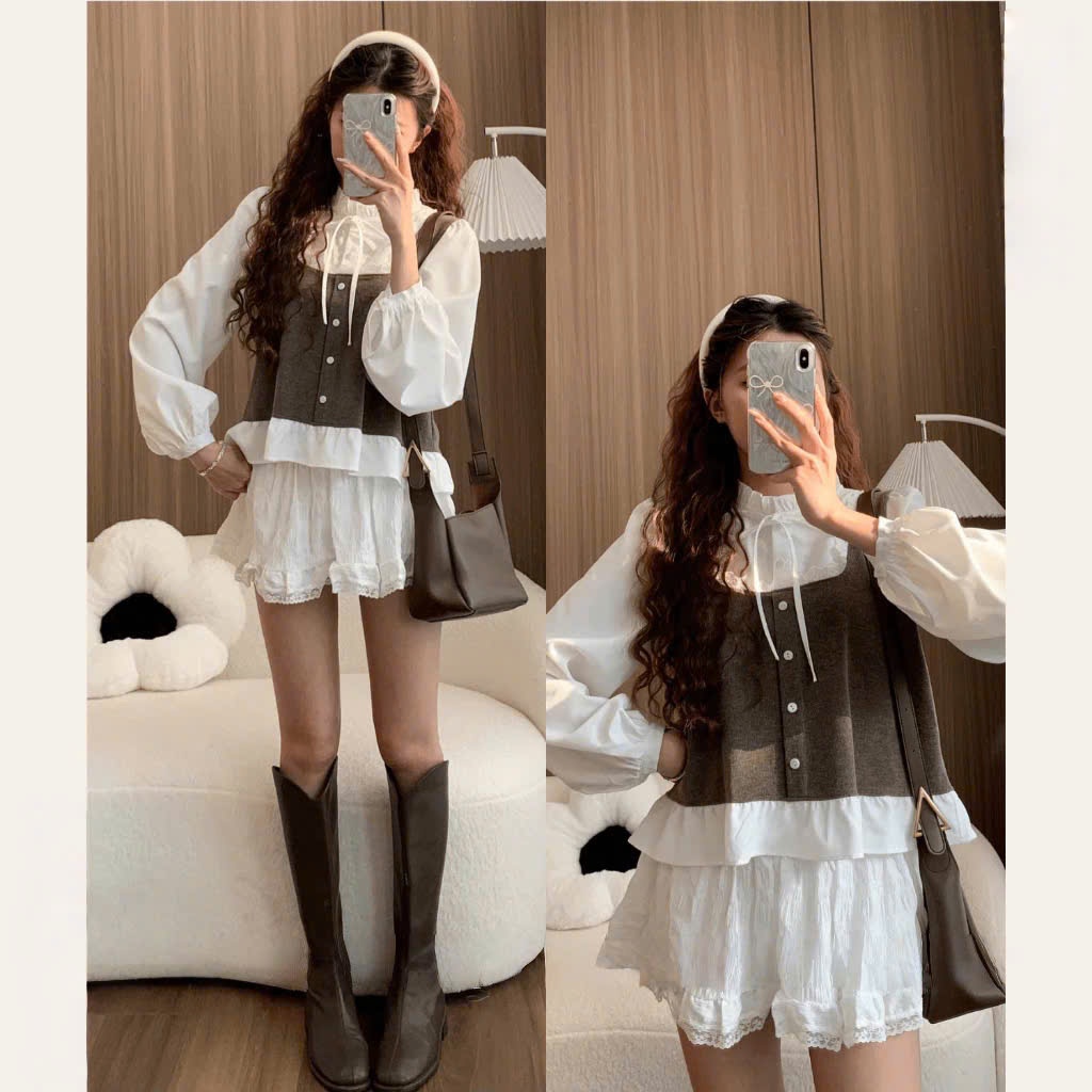 - - การออกแบบ: เสื้อประกอบด้วยสองชั้น - ชั้นนอกเป็นเสื้อกั๊กสีน้ำตาลเทาอ่อนทรงหลวมกระดุมด้านหน้า ชั้นในเป็นเสื้อแขนยาวยางยืดที่ข้อมือคอระบาย เน็คไทแบบผูกโบว์ช่วยสร้างไฮไลท์ที่นุ่มนวล