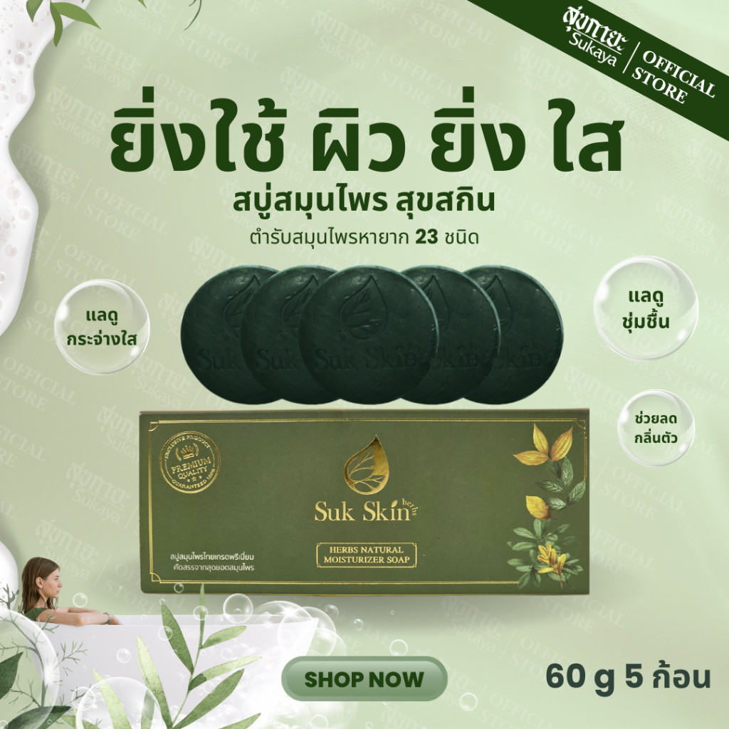 Suk Skin Herbs ขนาด60g 5ก้อน สบู่สมุนไพรสุขสกินเฮิร์บซ์ สบู่สูตรเย็น ดับกลิ่นกาย ดับกลิ่นแก่ ผิวขาว