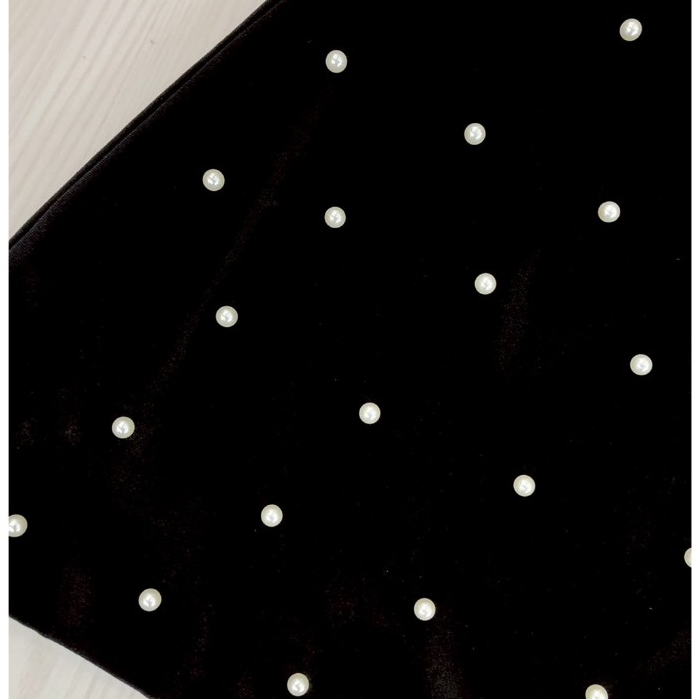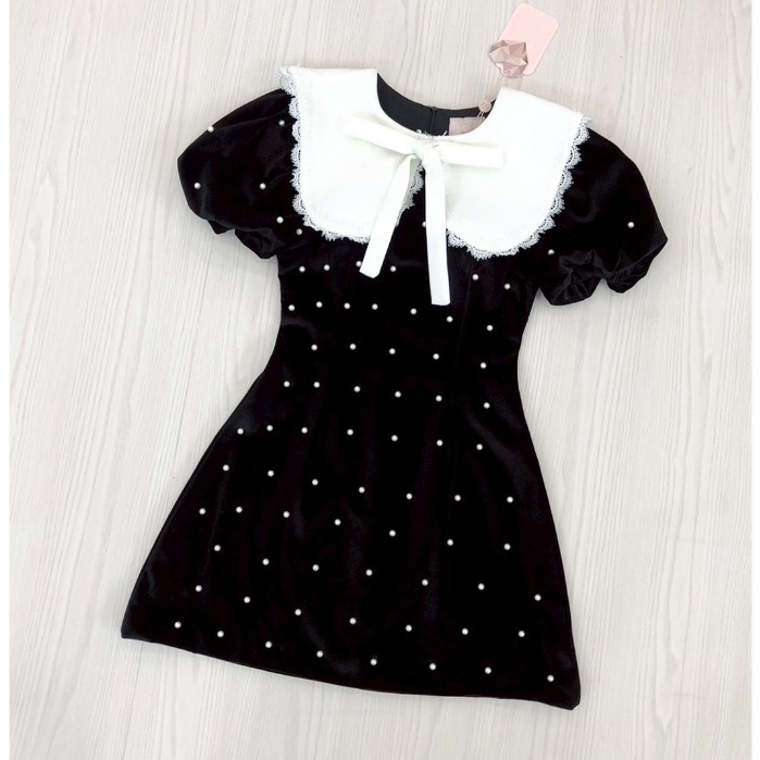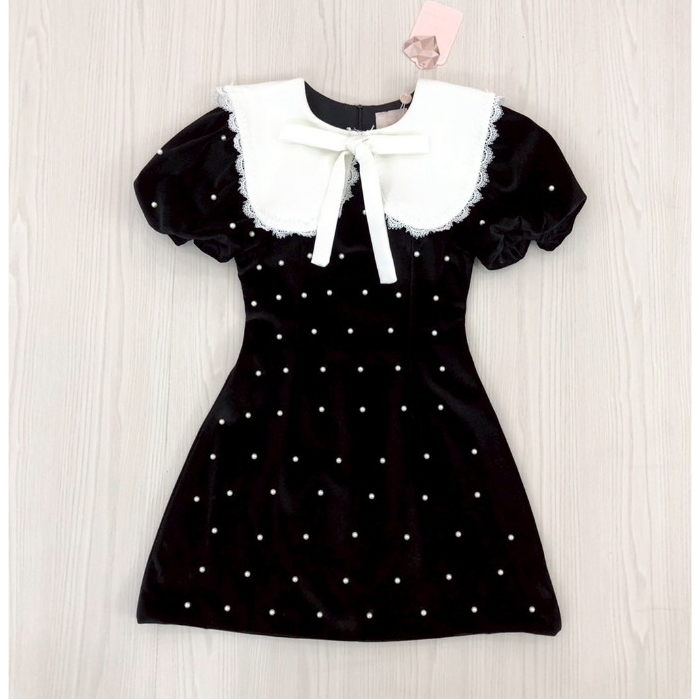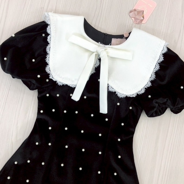(มี3XL) Maria Diamond สีดำ Pearl Velvet Dress เดรสกำมะหยี่ตอกมุก แขนสั้นตุ๊กตา ปกกะลาสี ซิปหลัง มีซับใน