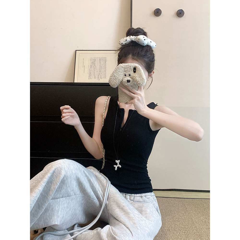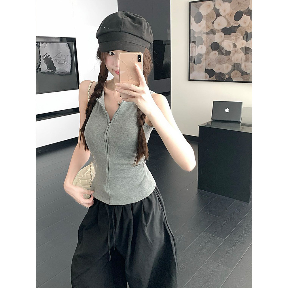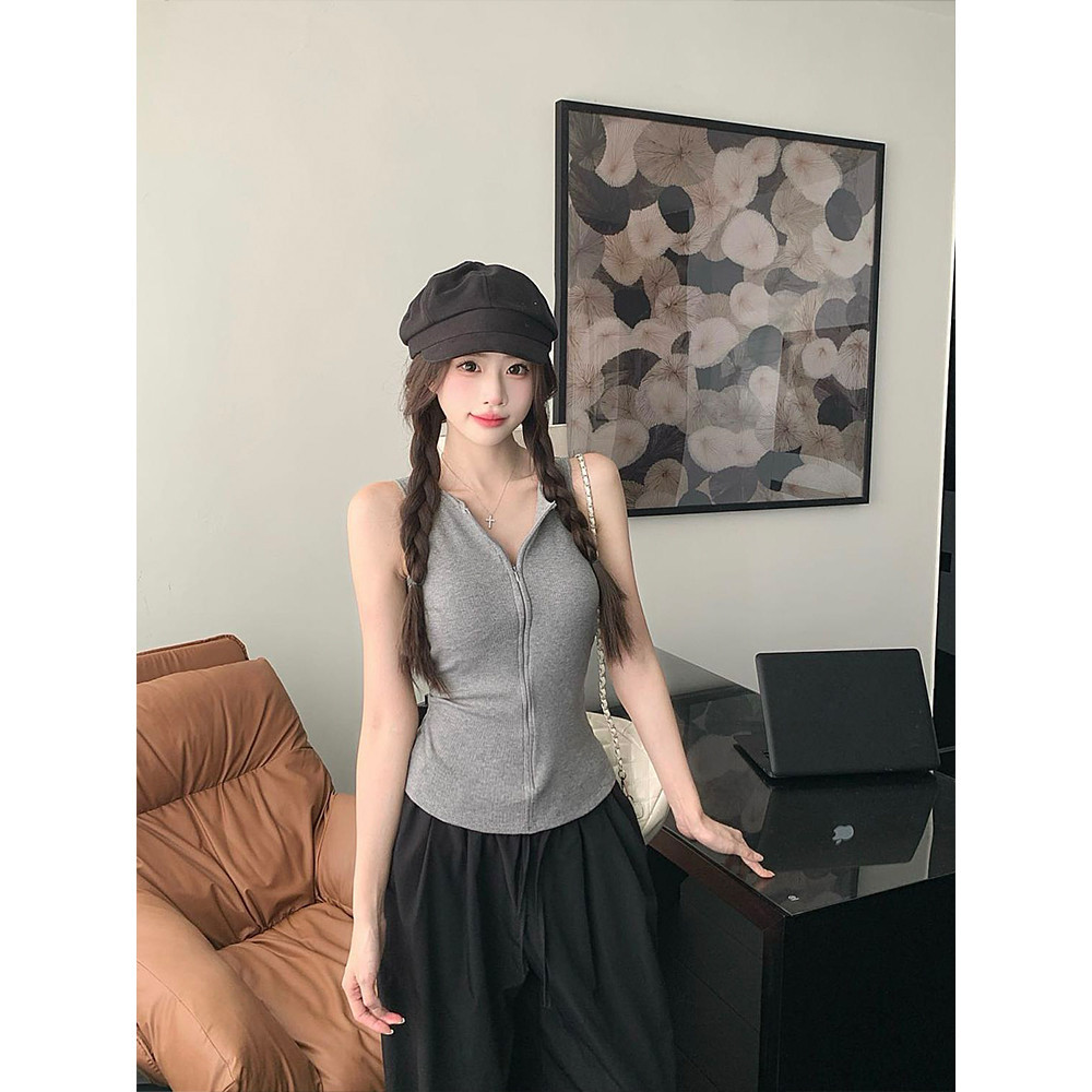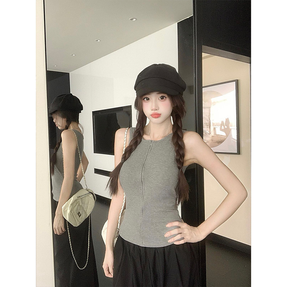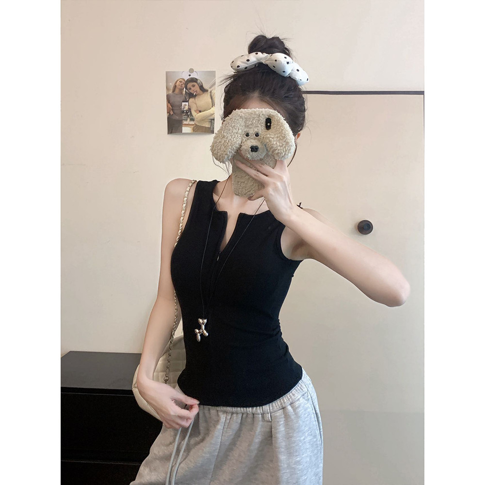 เสื้อกล้ามคอกลม สีพื้น ดีเทลซิปด้านหน้าสีพื้น