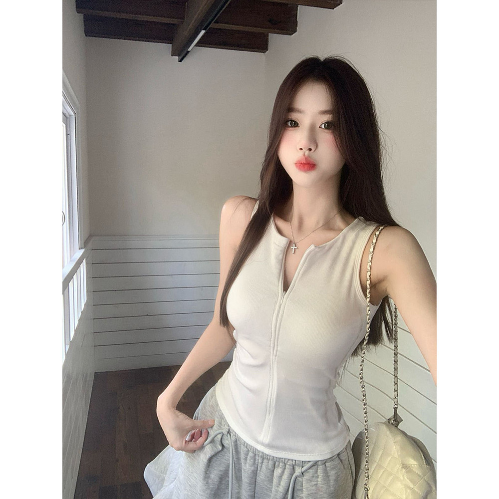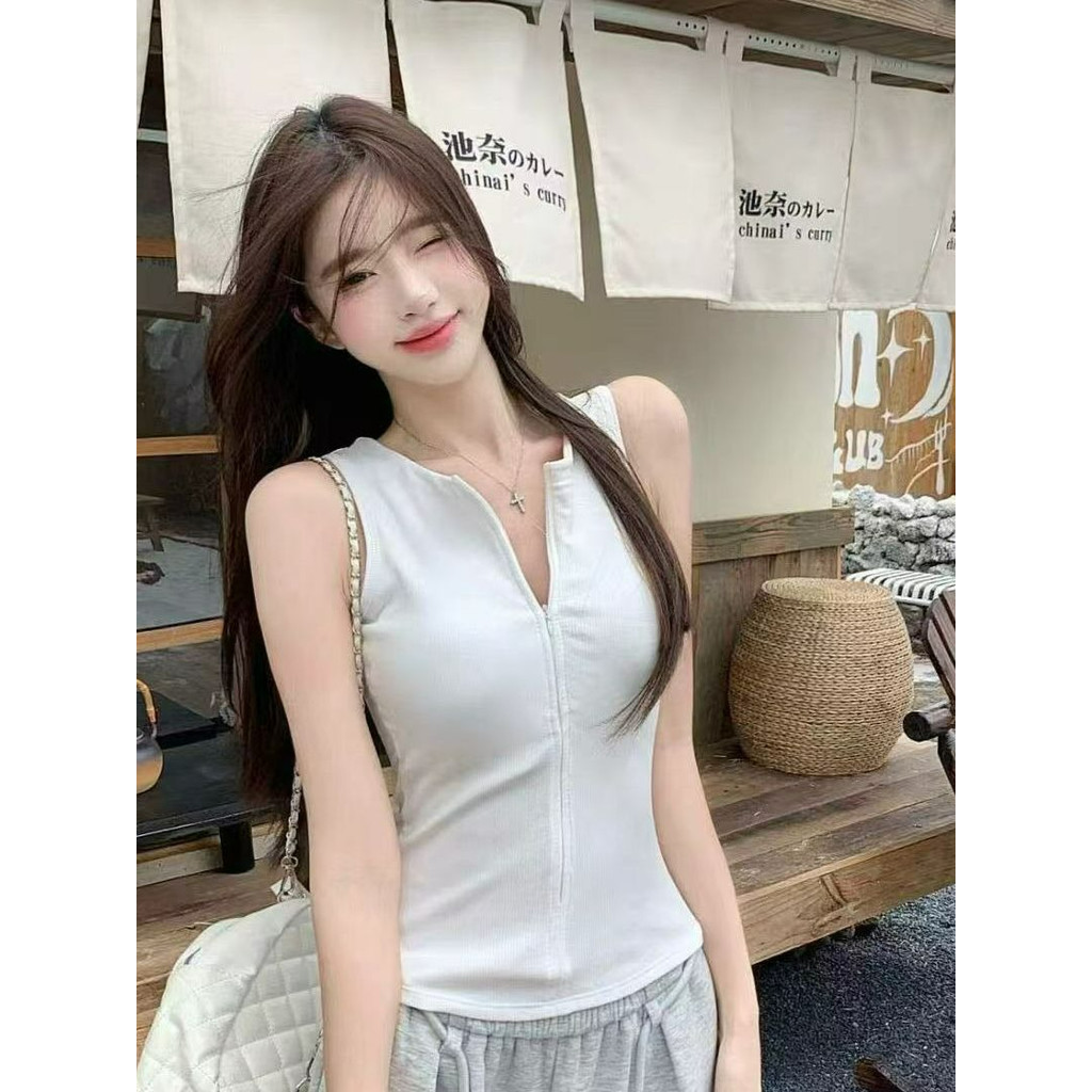 ?Evelyn?เสื้อกล้ามคอกลม สีพื้น ดีเทลซิปด้านหน้าสีพื้น เสริมฟองน้ำในตัว เข้ารูป เสื้อแขนกุด ใส่สบาย