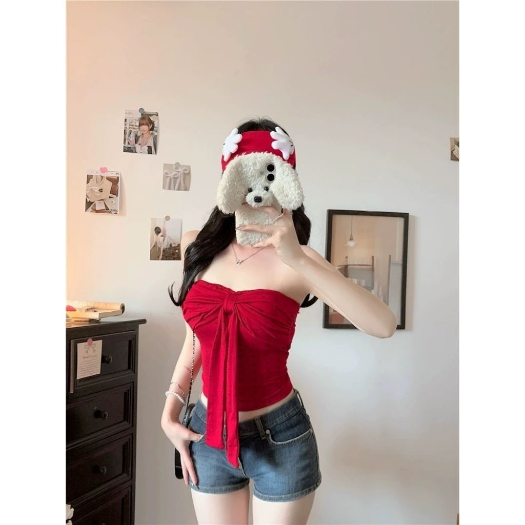 เสื้อเกาะอก เสริมฟองน้ำในตัว ดีเทลลายเท้าแมวน่ารัก ดีไซน์เปิดไหล่ สไตล์อเมริกัน เสื้อผ้าผู้หญิง