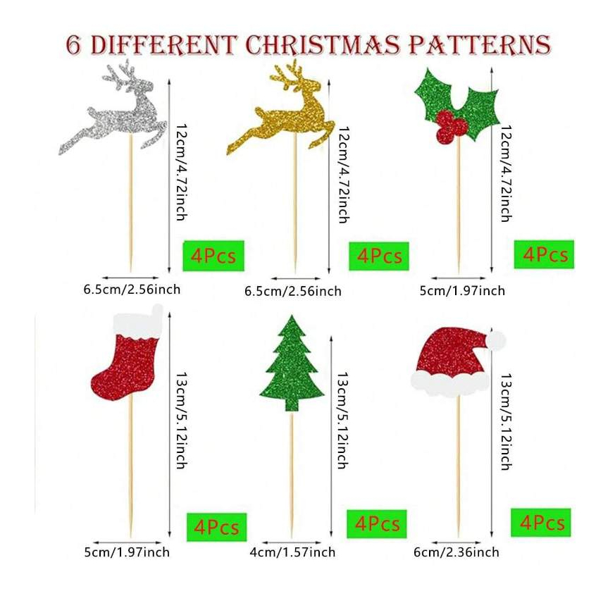 การออกแบบที่แตกต่างกัน 4 แบบ: ท็อปเปอร์คัพเค้ก 24 ชิ้น (รวมหมวกซานตาต้นคริสต์มาสถุงเท้ากวางเรนเดียร์) แต่ละ 6 ชิ้นต่อแพ็คเกจ