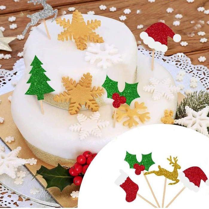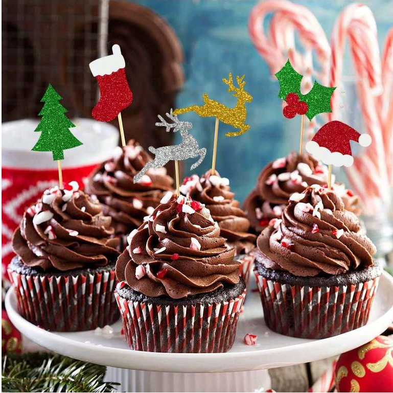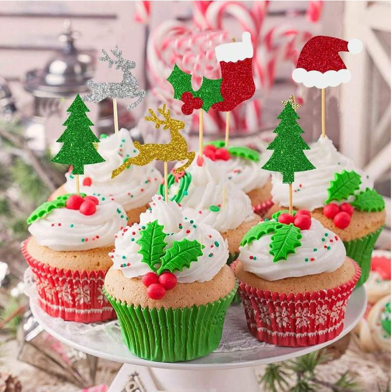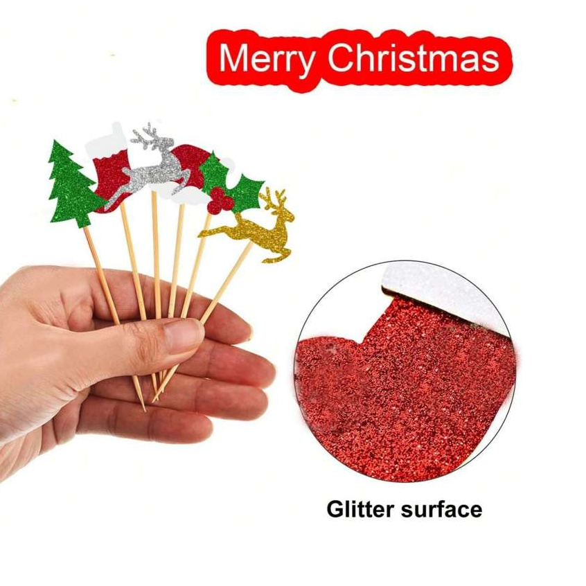 ปิ๊กผลไม้อาหารคริสต์มาส 24 ชิ้น – เครื่องประดับท็อปเปอร์คัพเค้กกลิตเตอร์พร้อมหมวกซานต้า ต้นคริสต์มาส ถุงเท้าสีแดง & กวางเรนเดียร์สีทอง