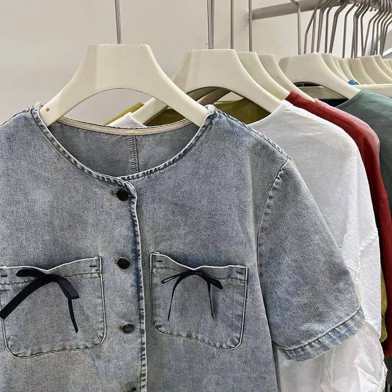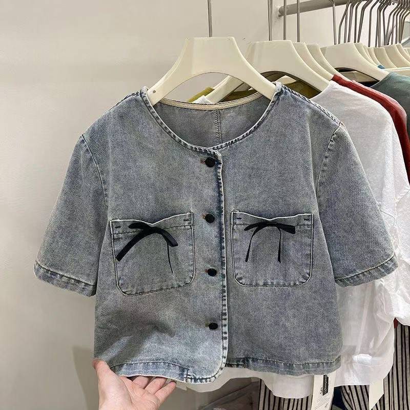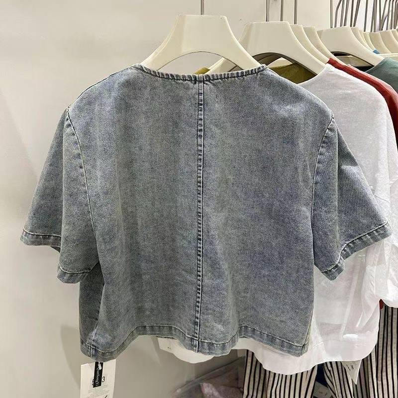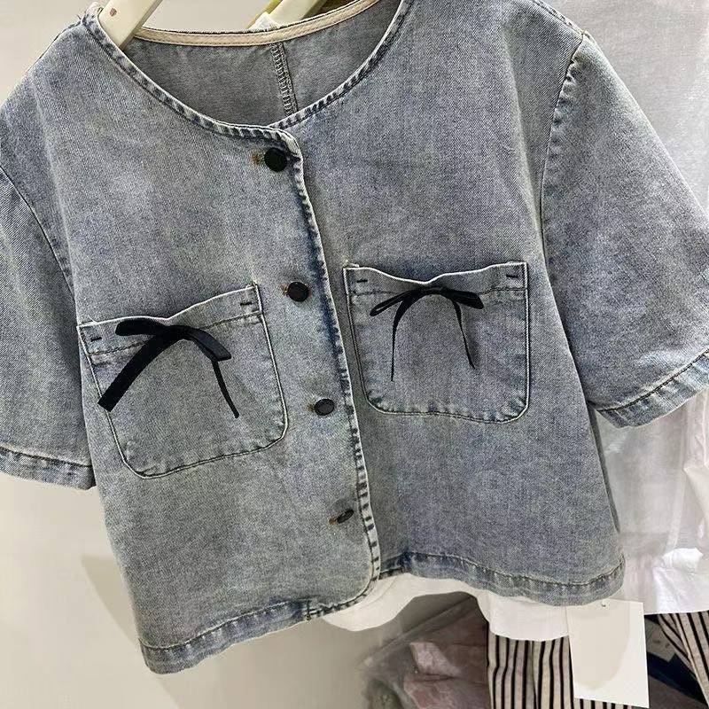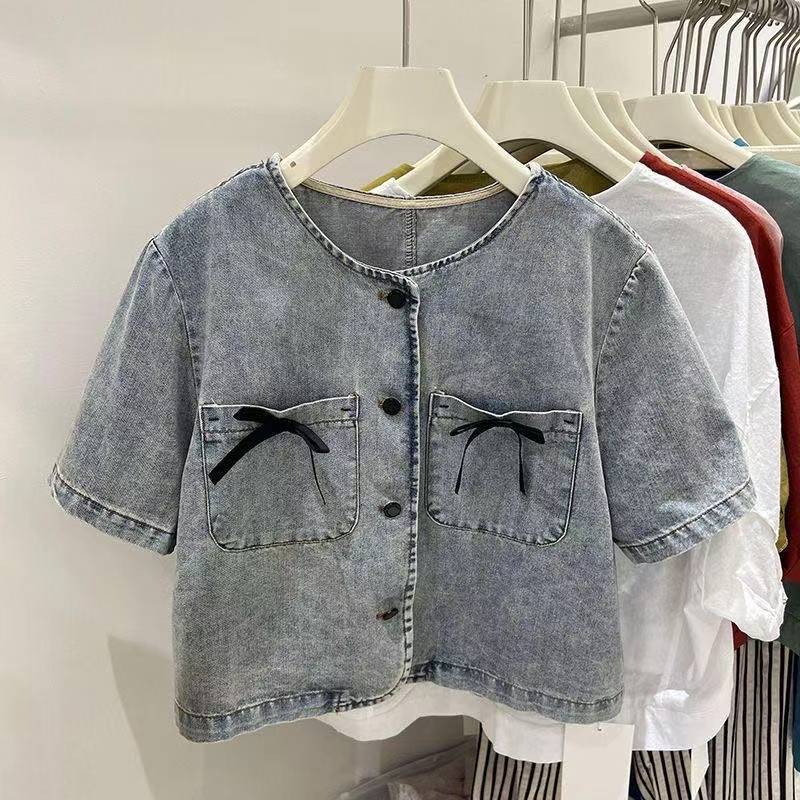 เสื้อเบลาส์เดนิมคอปกกลมแขนสั้นทรงหลวมแฟชั่นสตรีเกาหลี
