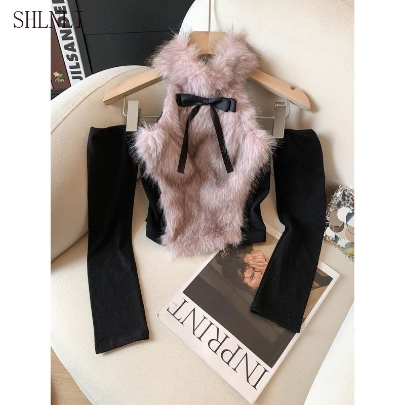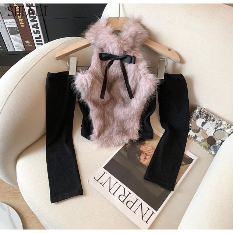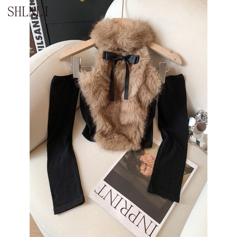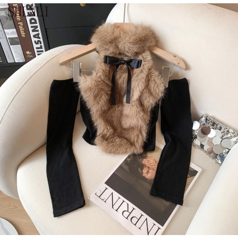 เสื้อกั๊กลดความพองแบบสลิม핏สำหรับผู้หญิง มีโบว์และรายละเอียดการปักที่สวยงาม ออกแบบมาให้เปิดไหล่และเหมาะสวมในฤดูใบไม้ร่วงและฤดูหนาว
