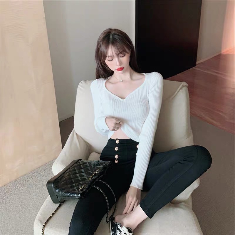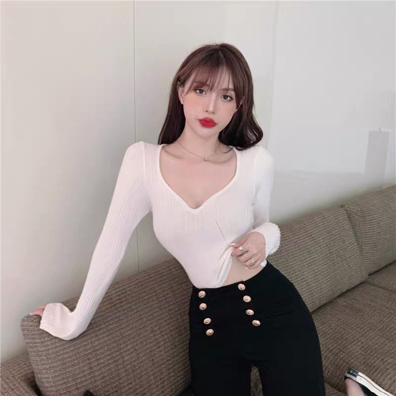 Cicishop(พร้อมส่ง)เสื้อครอปแขนยาว คอกว้างผ่ายาววี งามแฟชั่นสุดฮิต(5953)