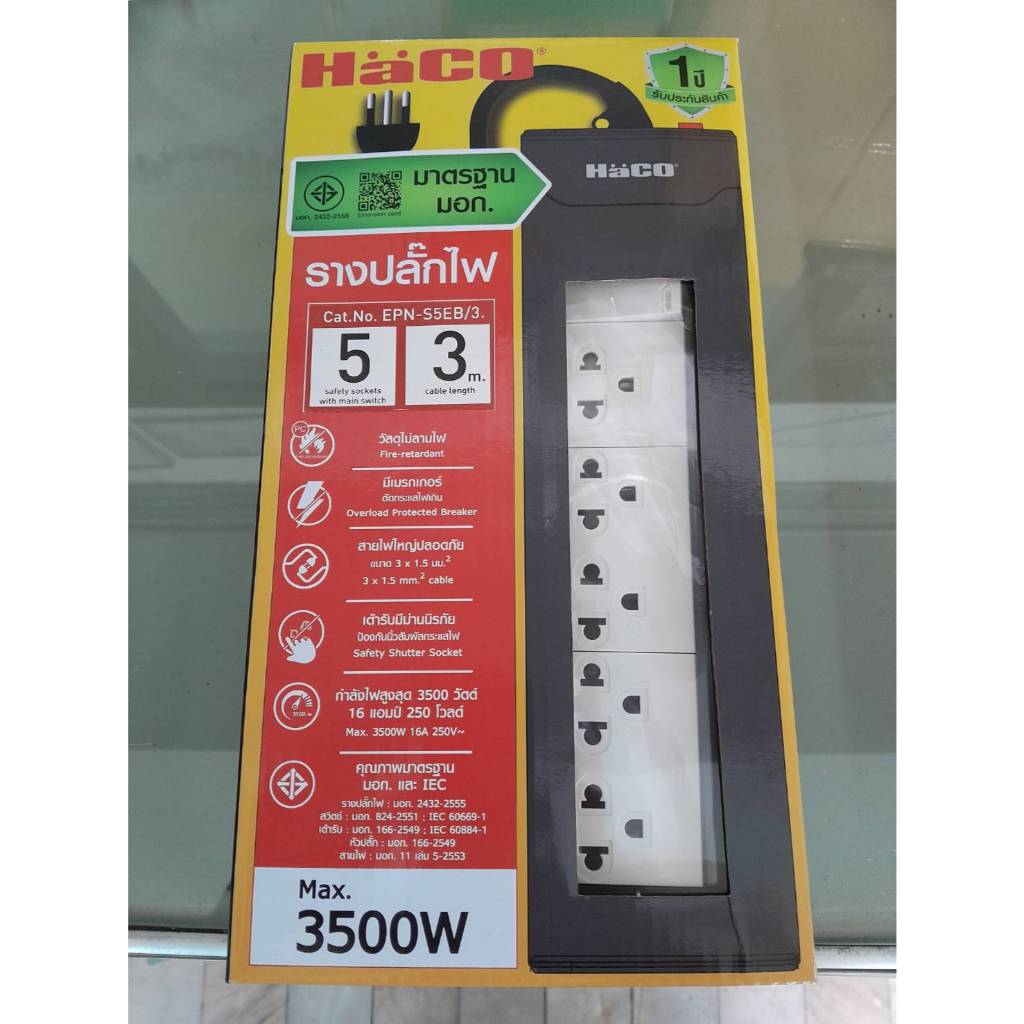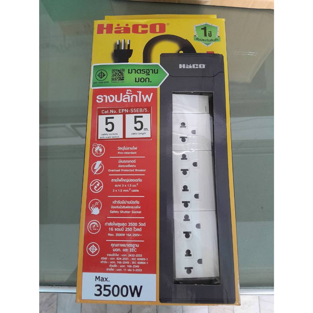 HACO ปลั๊กพ่วง รางปลั๊ก (มี มอก.) 3 ช่อง 2 เมตร / 5 ช่อง 3 เมตร / 5 ช่อง 5 เมตร มี มอก. แข็งแรง ทนทาน กำลังไฟสูงสุด 3500