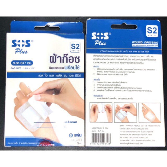SOS Plus S2 ผ้าก๊อซ ปิดแผลแบบพร้อมใช้ ขนาด 6×7 ซม. 5 แผ่น (1 กล่อง)
