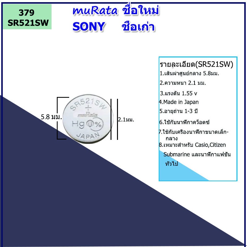 ถ่านนาฬิกาโซนี่ SONY หรือ ชื่อใหม่ถ่านมูราตะ muRata มีหลายรุ่นที่นิยมใช้กันมาก คือ SR521SW หรือ 379 ของถ่าน Renata