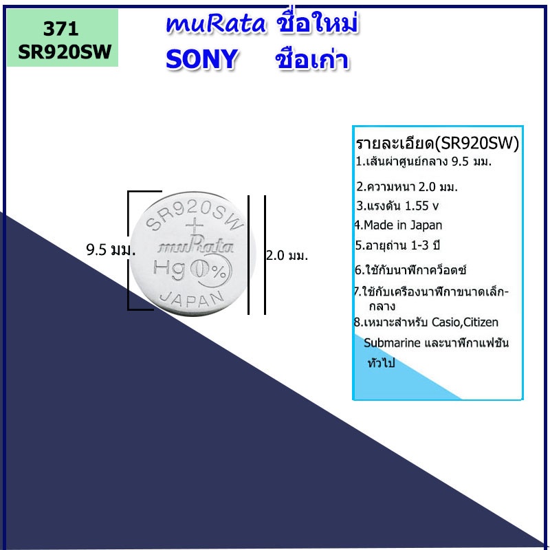 SR920SW หรือ 371 ของถ่าน Renata รุ่น SR920W เป็นถ่านของmaxell ซึ่งผลิตในญี่ปุ่