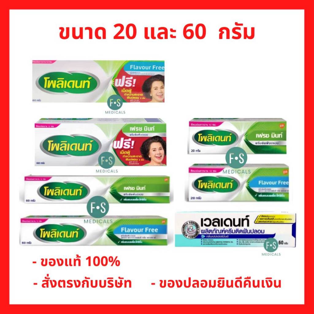 Polident โพลิเดนท์ ครีมติดฟันปลอม 20 กรัม , 60 กรัม ,60 กรัมแถมเม็ดฟู่ 2 เม็ด