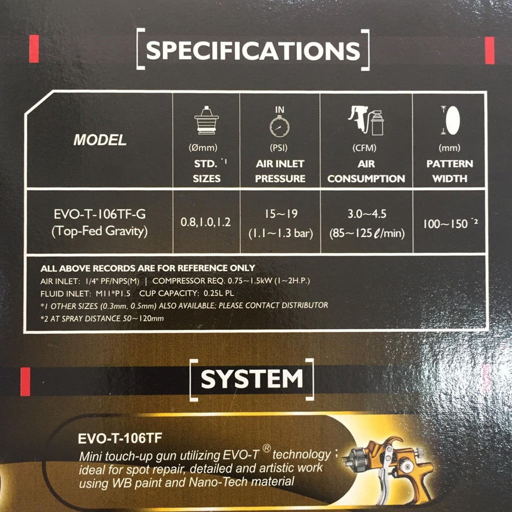 เป็นกาสำหรับพ่นสีจริงและเคลียร์หรือสีอื่นๆ ตามที่ต้องการ หัวกามีขนาด 1.0 มม. ถ้วยพลาสติกขนาด