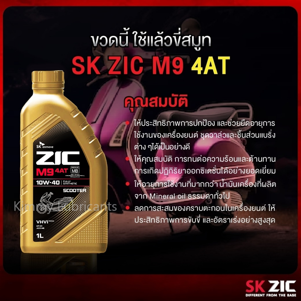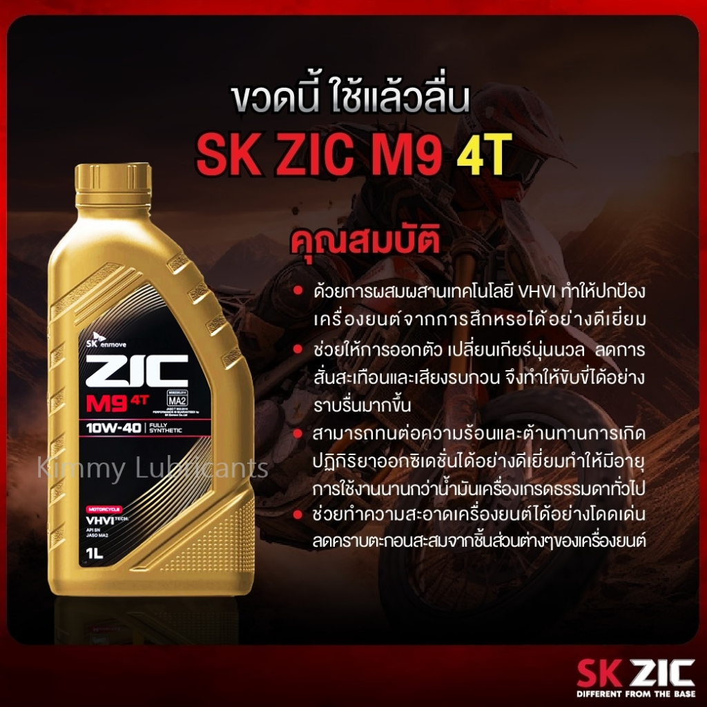 Zic M9 น้ำมันเครื่องสังเคราะห์แท้ 100% ที่ถูกคิดค้นมาเพื่อมอเตอร์ไซค์อย่างแท้จริง ด้วยเทคโนโลยีที่ลํ้าหน้าแบบ VHVI Tech การันตีการขับขี่ได้อย่างราบลื่นตลอดเส้นทาง อีกทั้งยังช่วยปกป้องเครื่องยนต์จากการสึกหรอได้ในทุกสภาวะการใช้งาน