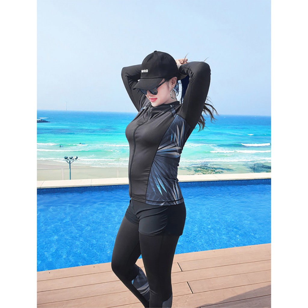 ชุดว่ายน้ำผู้หญิงไซส์ใหญ่ 2XL-5XL (5 ชิ้น) พร้อมส่งจากไทย ชุดว่ายน้ำแขนยาว สีดำแต่งลายกราฟฟิก