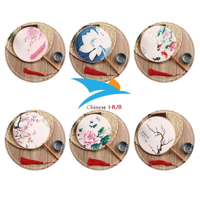พัดกลม พัดจีน พัดลายจีนๆ พัดลายพู่กันจีน พัดลายดอกไม้ พร้อมพู่ห้อย พัดจีนโบราณแบบกลม ตัวพัดเป็นผ้าพิมพ์ลายศิลปะจีน