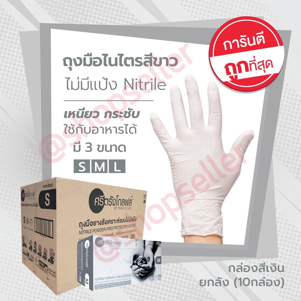 [ขายดี ส่งไว ออกบิลได้] ถุงมือยางศรีตรัง ไนไตรสีขาว กล่องสีเงิน แบบไม่มีแป้ง ขายยกลัง