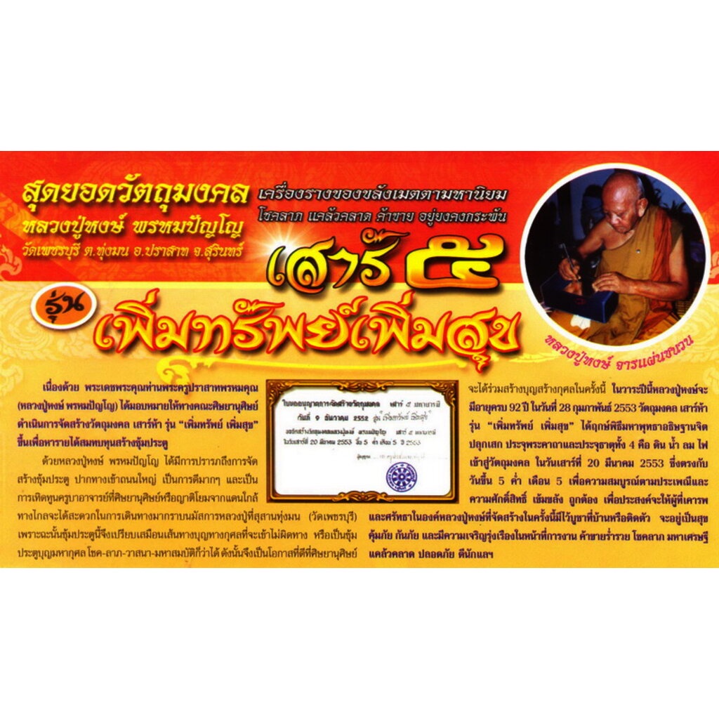 วัตถุมงคล เสาร์ ๕ รุ่น " เพิ่มทรัพย์ เพิ่มสุข " นี้ ได้จัดสร้างขึ้นเนื่อง ในวาระปีนี้หลวงปู่หงษ์ พรหมปัญโญ มีอายุครบ 92 ปีในวันที่ 28 กุมภาพันธ์ 2553 วัตถุมงคลเสาร์ห้า รุ