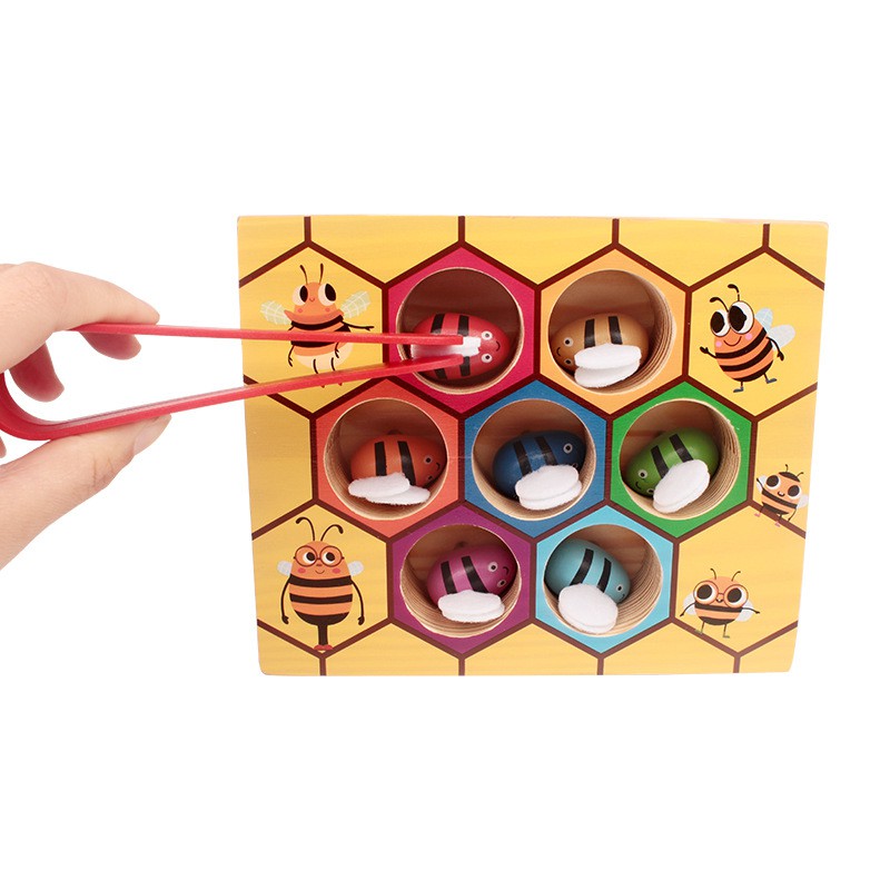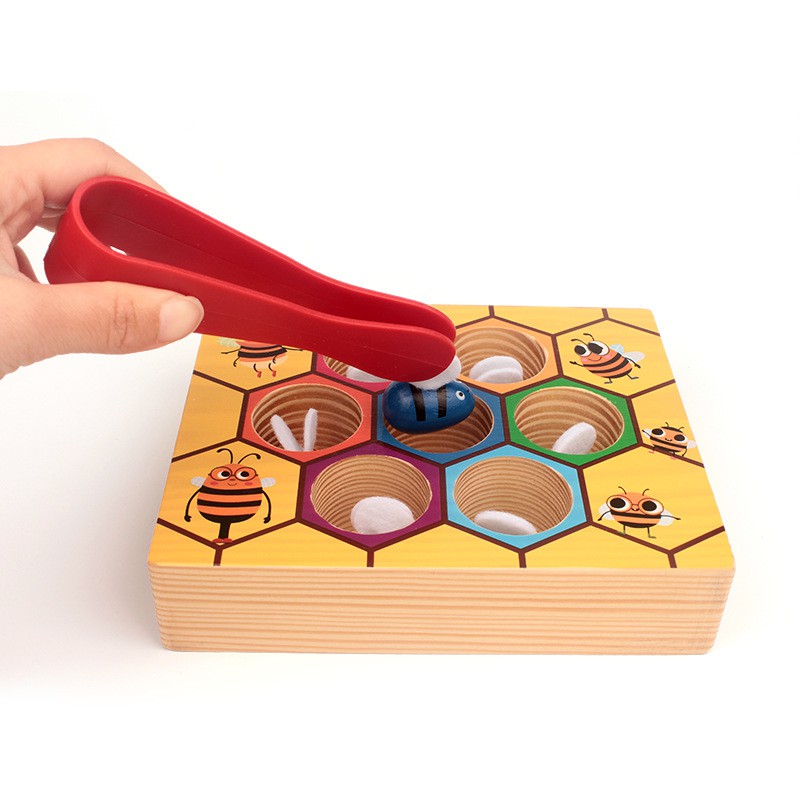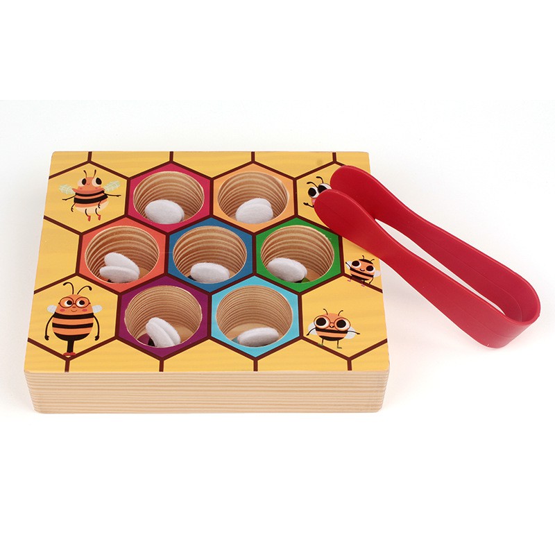 Treeyear ขอToddler Fine Motor Skill Toy, Clamp Bee to Hive Matching Game, Montessori Wooden Color Sorting Puzzle, Early Learning Preschool Educational Gift Toy for 3 4 5 Years Old Kids