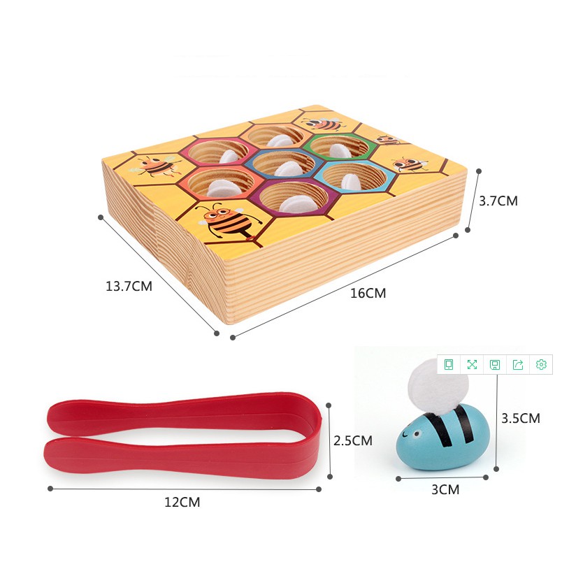 ชุดของเล่นประกอบด้วยรังผึ้ง 7 ตัวปากคีบและกล่องเก็บของหนึ่งกล่อง