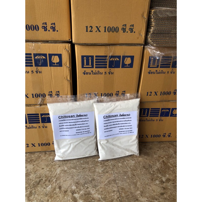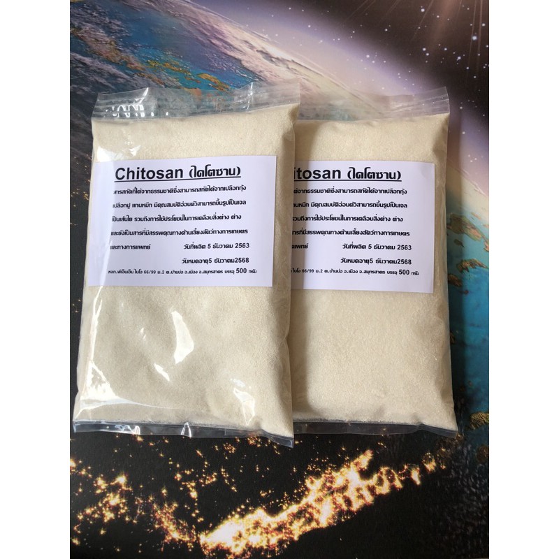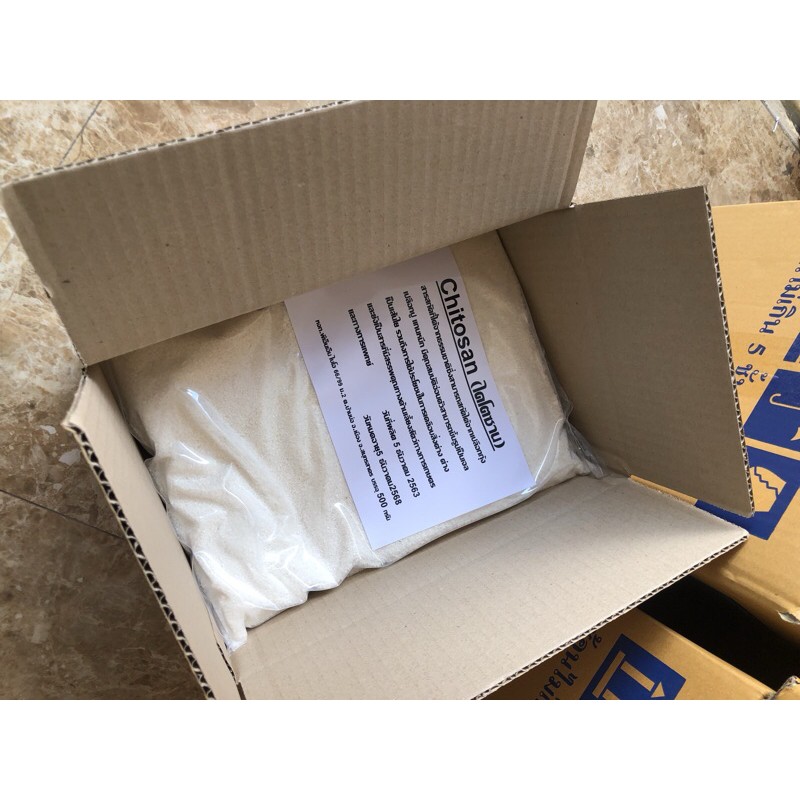 ไคโตซานแบบผงนำไปแปรรูปเกี่ยวกับการเลี้ยงสัตว์นำไปทำปุ๋ย และทางเครื่องสำอางบรรจุ 500กรัมหรือครึ่งกิโลกรัม