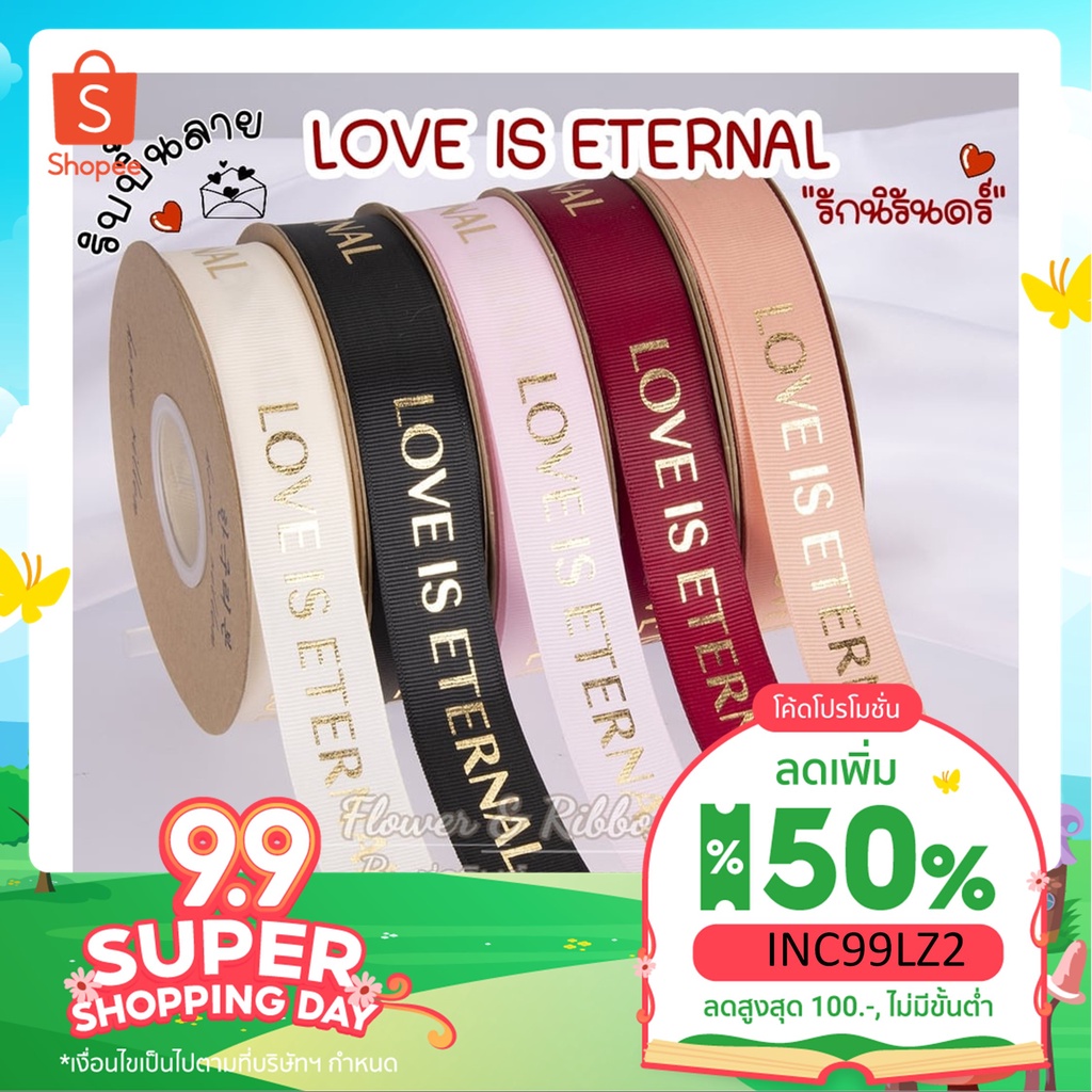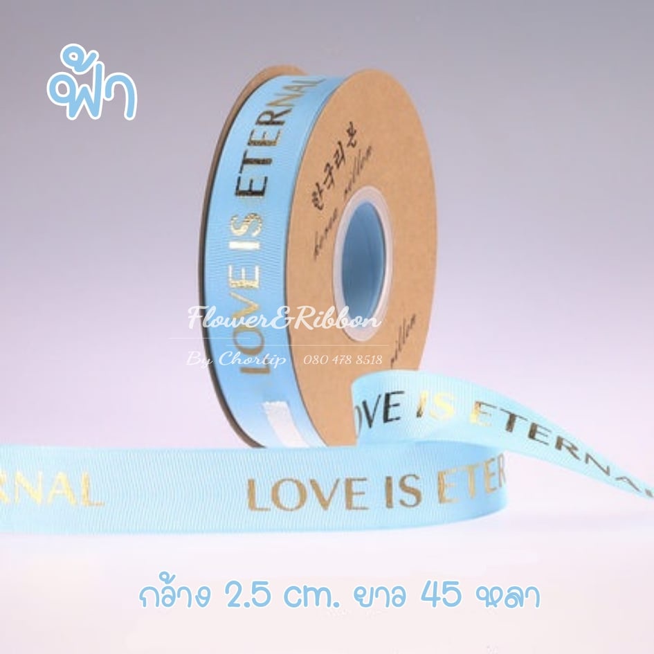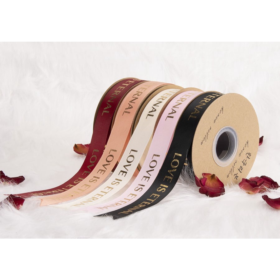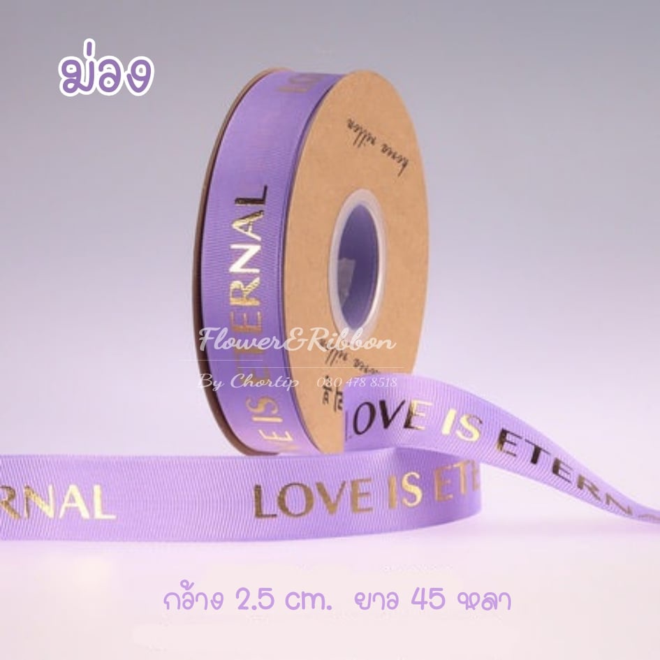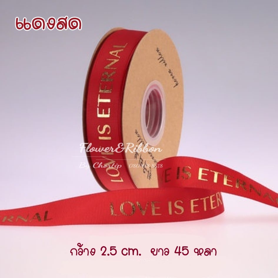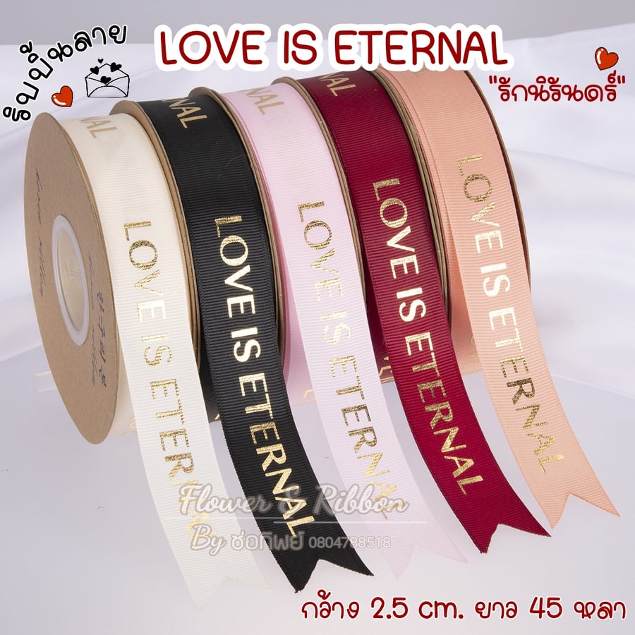 ริบบิ้นผ้าซาตินลาย LOVE IS ETERNAL กว้าง 2.5 ซม. ยาว 45 หลา พิมพ์ลายสีทอง (สินค้าพร้อมส่ง) ริบบิ้นผ้า