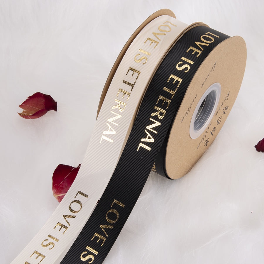 ริบบิ้นผ้าซาตินลาย LOVE IS ETERNAL พิมพ์ลายสีทอง