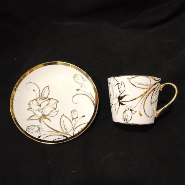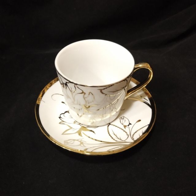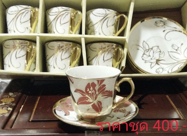 ชุดแก้วกาแฟ+จานรอง ชุดน้ำชาเซรามิค ชุบทองลายสวย เหมาะสำหรับของฝากของขวัญ ใส่กล่อง6แก้ว+6จาน 咖啡茶具 ลายดอกไม้ชุบทอง