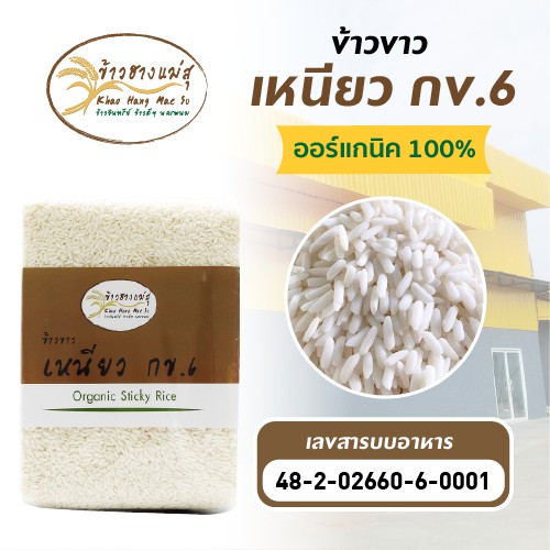 ข้าวเหนียว กข.6 ข้าวเหนียวขาว ออร์แกนิคแท้ ปลอดภัย หอม นุ่ม สินค้ามี อย. โรงงานผลิตได้มาตรฐาน GMP ปริมาณ 1 กิโลกรัม