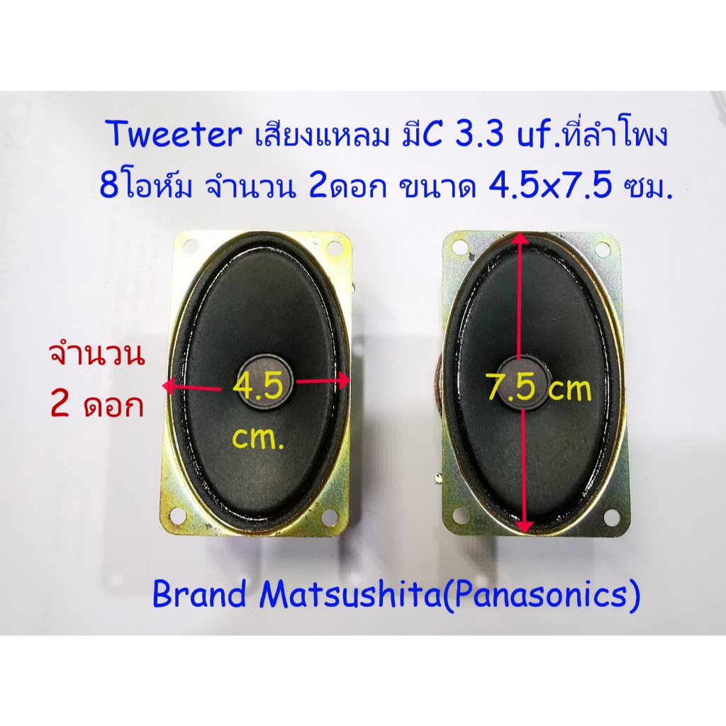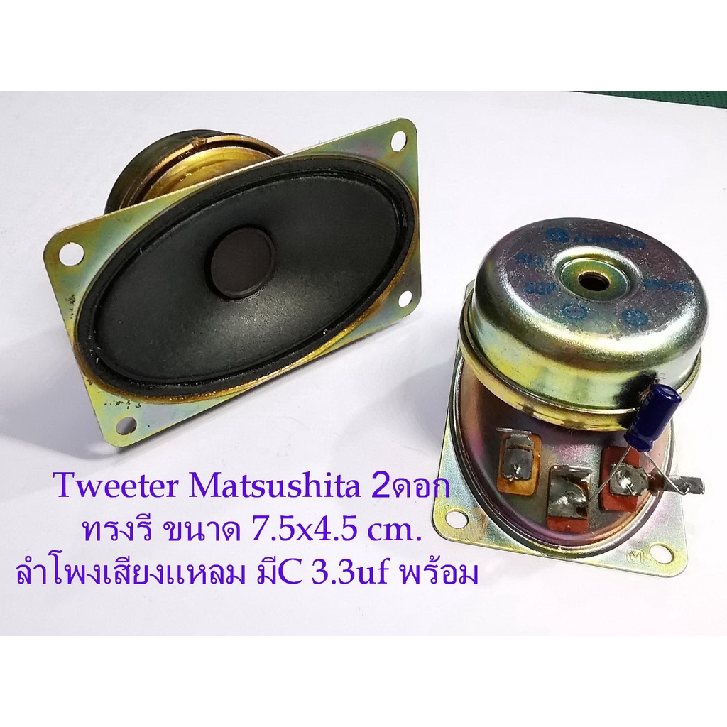 ลำโพงเสียงแหลมทรงรี มัทซูชิตะ(พานาโซนิค) สำหรับงาน DIY ขนาด 4.5x7.5 cm. 15 Watts 8 Ohm Matsushita(Panasonics) Speaker Tweeter 7.5x4.5 cm. **มี Capacitor 3.3uF 50V ติดกับลำโพง มีให้เลือก 1ดอก หรือ 2ดอก **มี Capacitor 3.3uF 50V (ติดอยู่กับลำโพง) ลำโพงเสียงแ