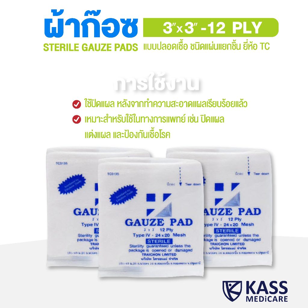 ผ้าก๊อซปลอดเชื้อ ผ้าก๊อซปิดแผล ชนิดแผ่นแยกชิ้น TC STERILE GAUZE PADS 3″ X 3″ (100 X 1 pads)
