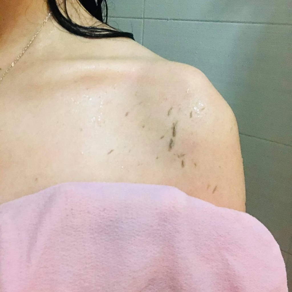 2.นำถุงมือชุบน้ำให้เปียกน้ำ บิดให้หมาดขัดขึ้น-ลง ให้ทั่วร่างกายตาม ขี้ไคลจะค่อยหลุดออ