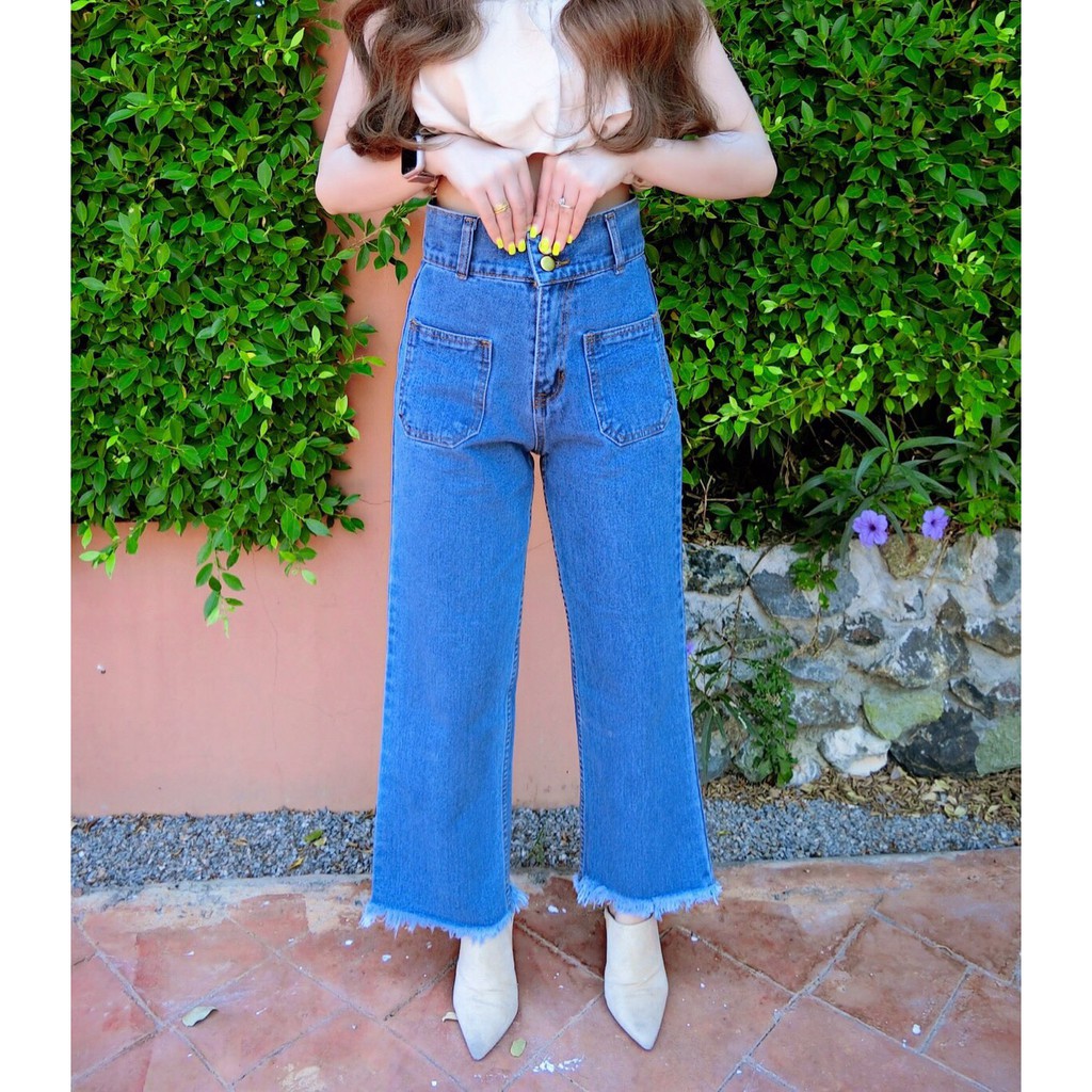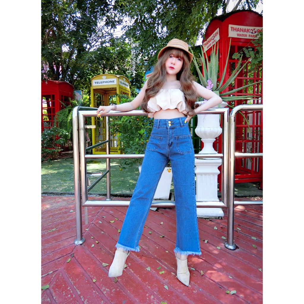 Cc jeans 164 S-5XL กางเกงยีนส์ผู้หญิง ทรงขาบาน ขอบสูง 2 กระดุม ปลายขาตัดรุ่ย แต่งกระเป๋าหน้า