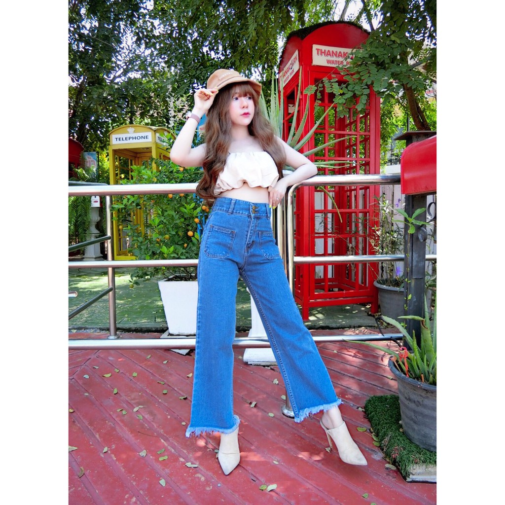 กางเกงยีนส์ ไม่ยืด เอวสูง 2 กระดุม ขากว้าง ยาว 36-37 นิ้ว
