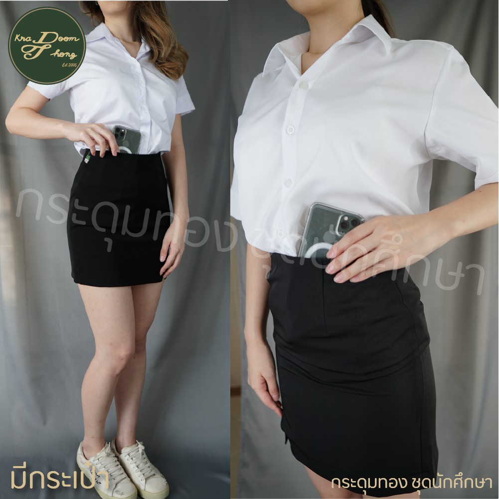 กระโปรงนักศึกษา ทรงเอ❗️มีกระเป๋า❗️ผ่าหลังทับ ผ้านาโน สีดำ (ความยาว 20″ 22″ 24″ 26″) ? กระดุมทอง