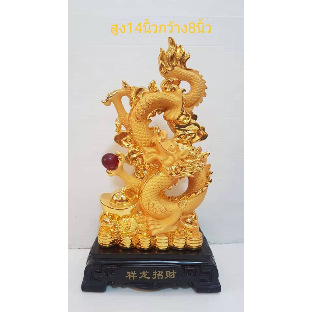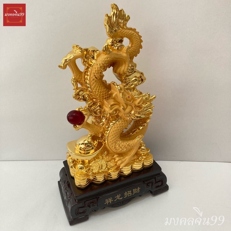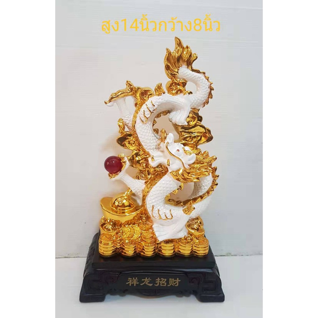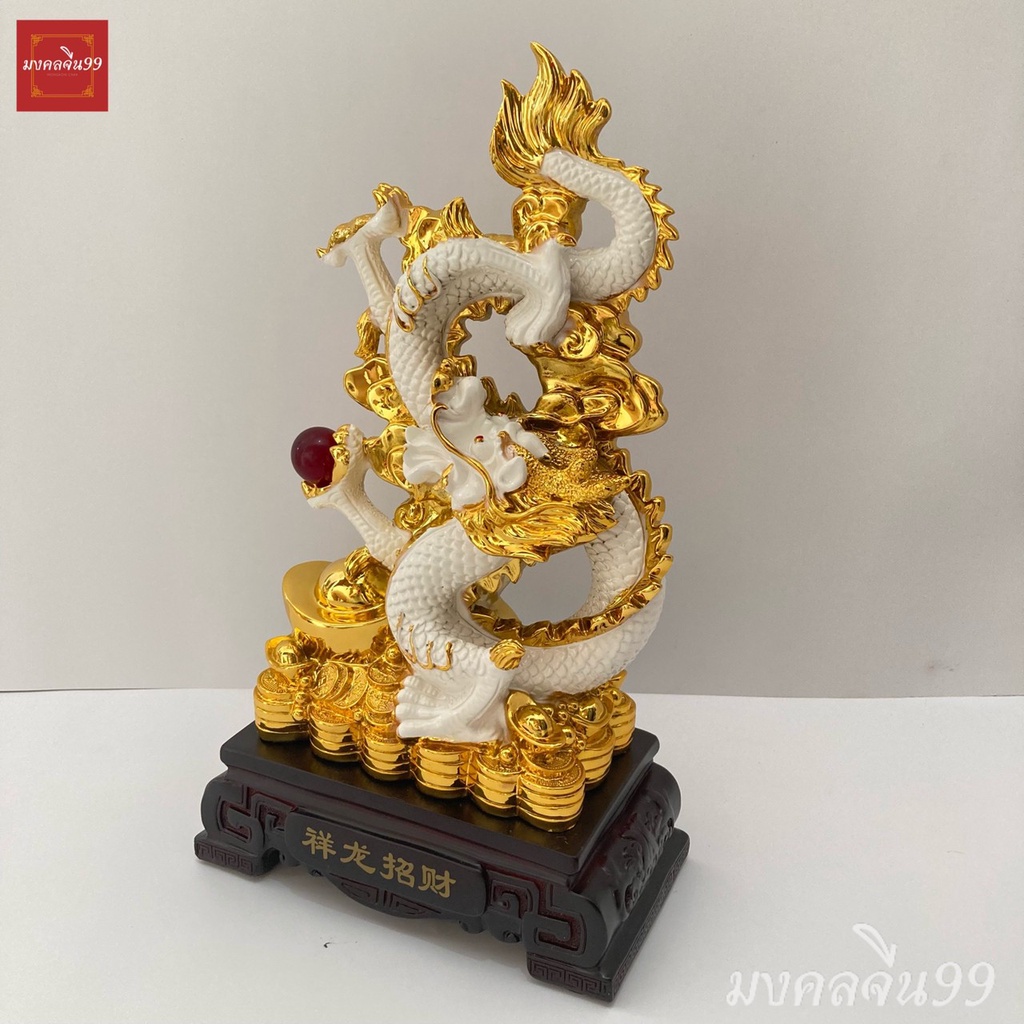มังกร ล่อแก้ว มังกรทอง เรซิ่นพ่นทรายทอง / ขาว ฐานไม้ สูง 14นิ้ว มังกรมงคล