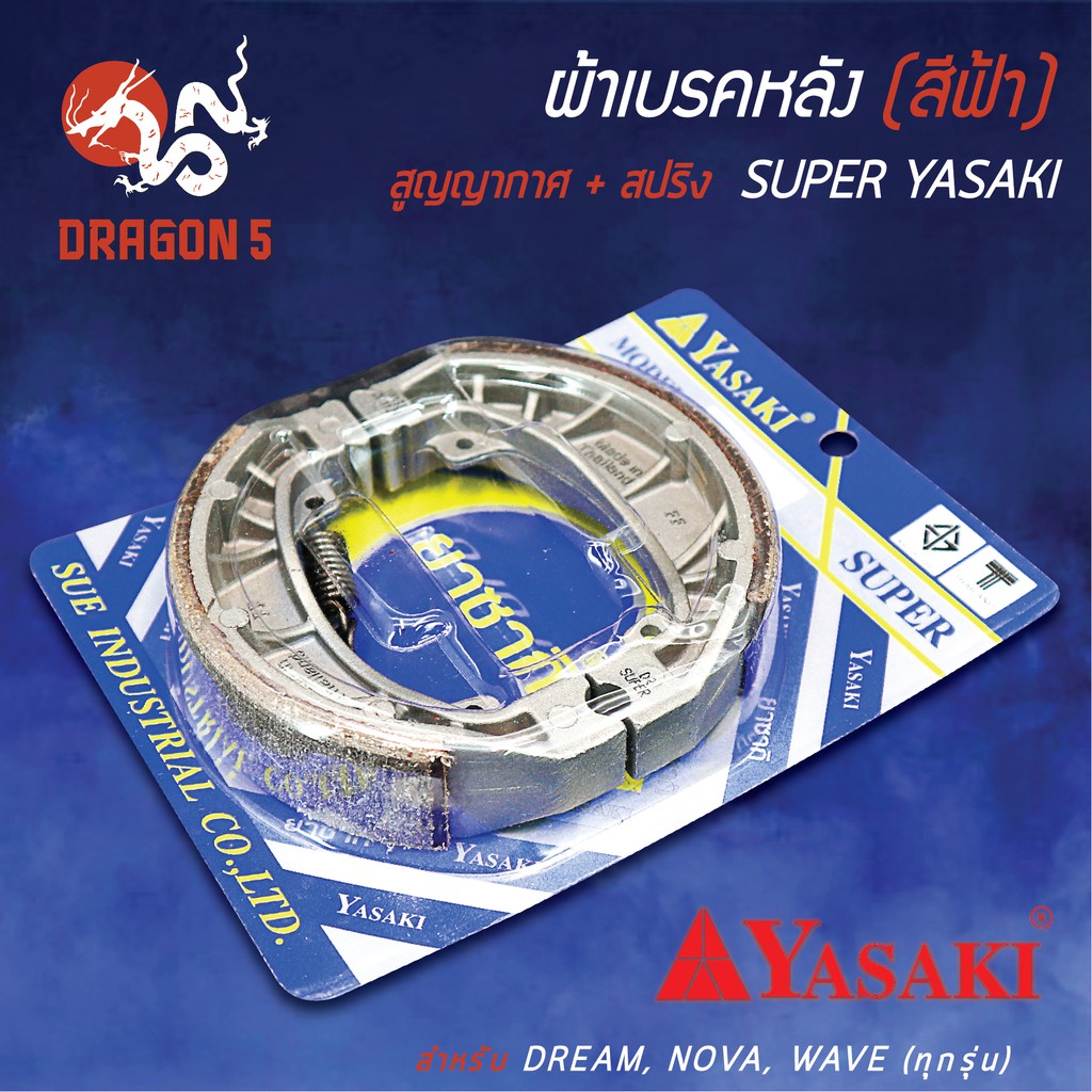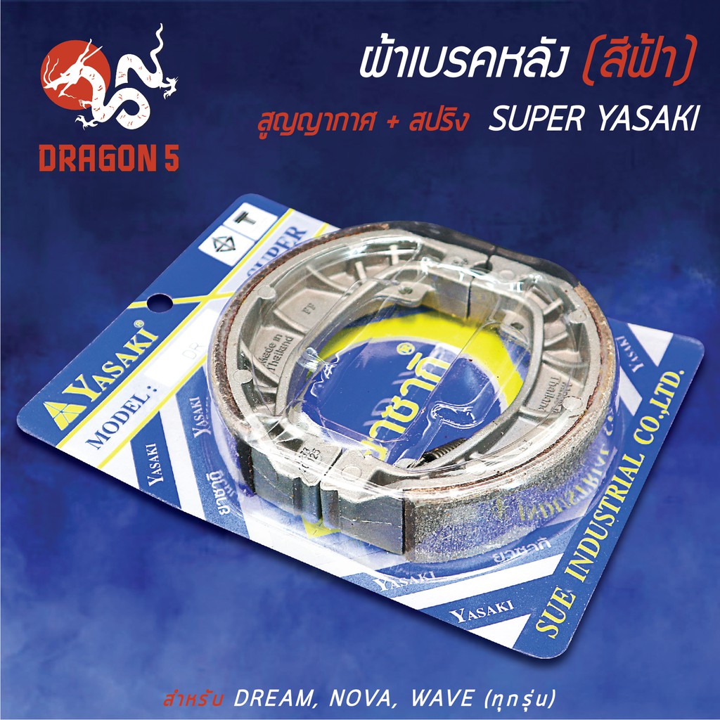 (กล่องน้ำเงิน/แพ็คสูญญากาศ+สปริง) YASAKI ผ้าเบรค, ผ้าดั้มหลัง, เบรคหลัง NOVA-S,โนว่า,DREAM,C100,WAVEทุกรุ่น,เวฟ125,เวฟ110i (ก้ามDREAM)